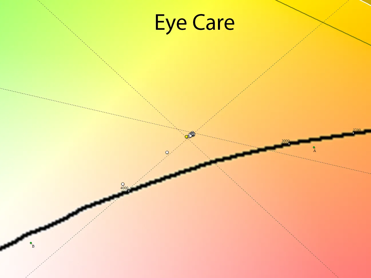 Режим Eye Care, как и предполагалось, уводит точку белого и все точки серого в «тёплую» область — в данном случае к 3700-3800К. Прямо скажем — излишне резкий и сильный переход.