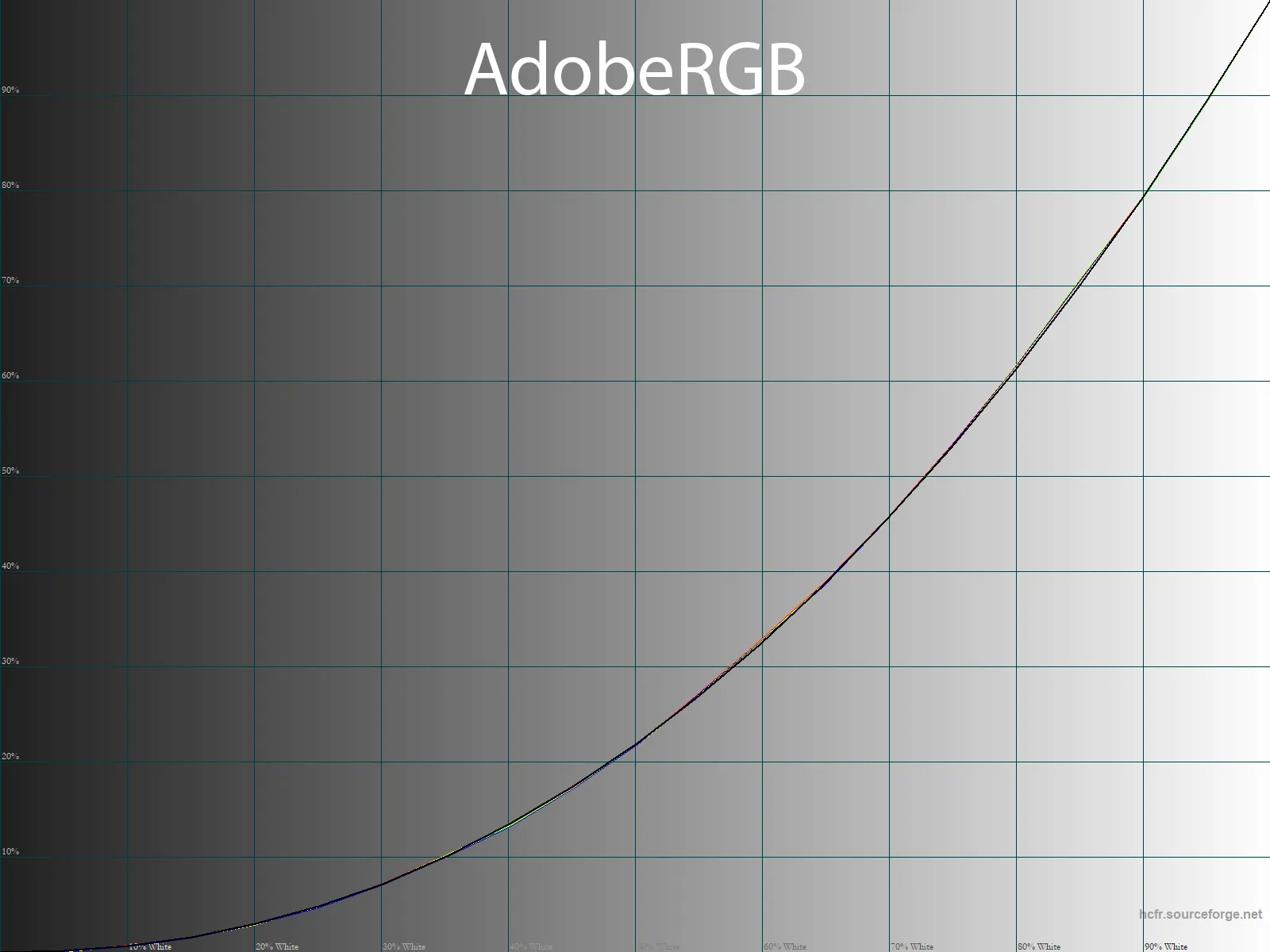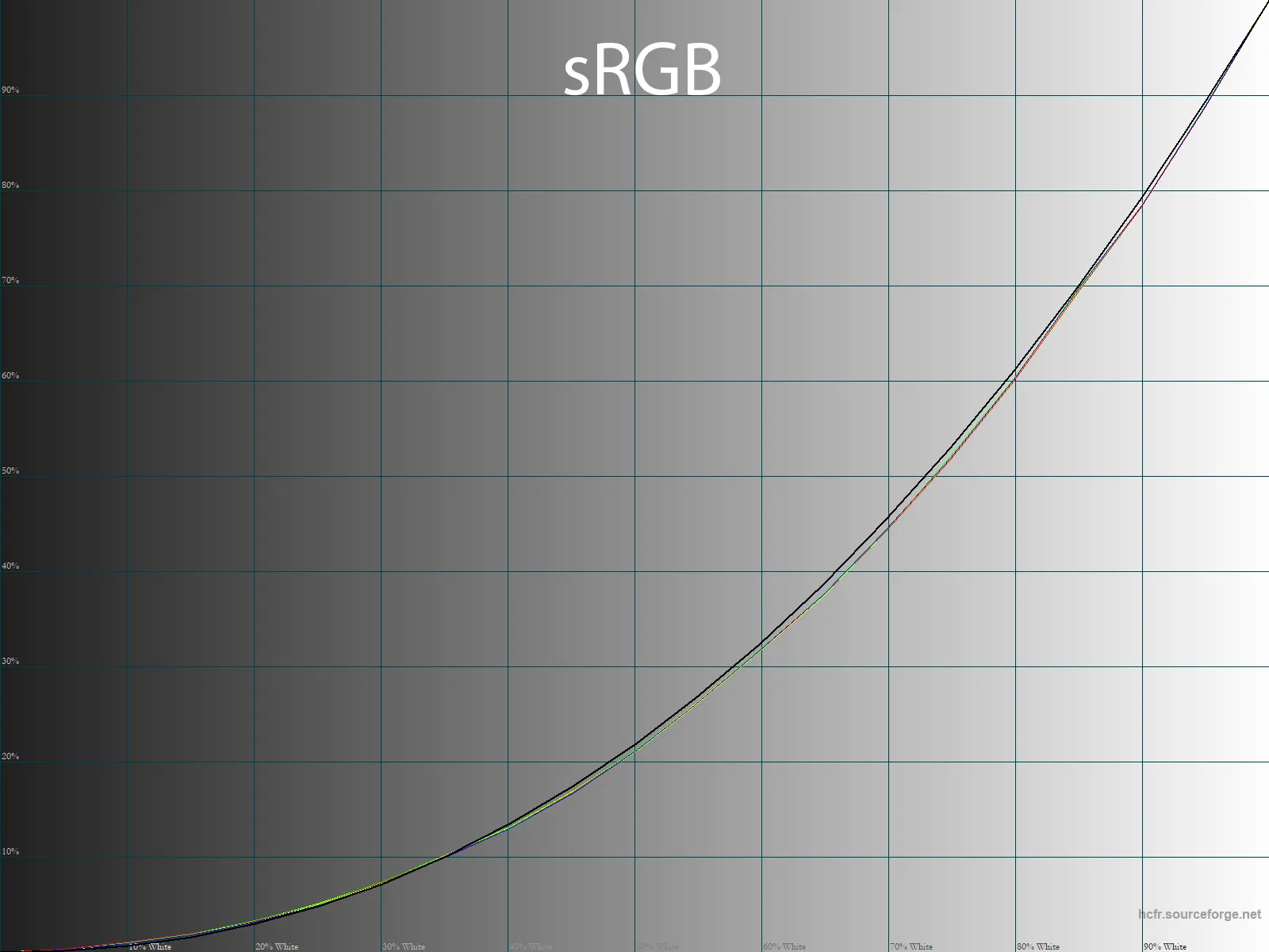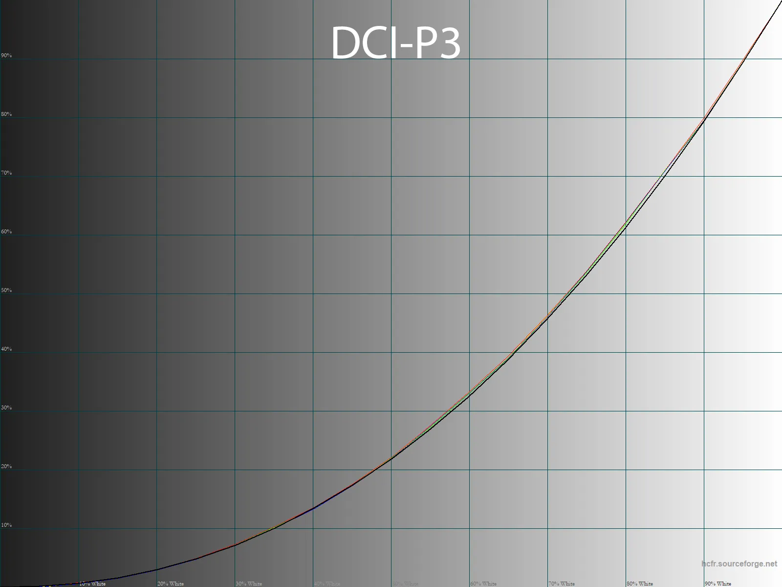 Проверенные режимы эмуляции с высокой точностью повторяют заводские установки в отношении настроек точки белого (особенно после многочасового прогрева экрана), а вот гамма-кривые выставлены ощутимо лучше — в полном соответствии стандартам: у sRGB улучшена различимость в тенях и есть небольшой провал в центральной части относительно гаммы 2.2, а DCI-P3 и AdobeRGB полностью легли на референсную кривую — идеально!