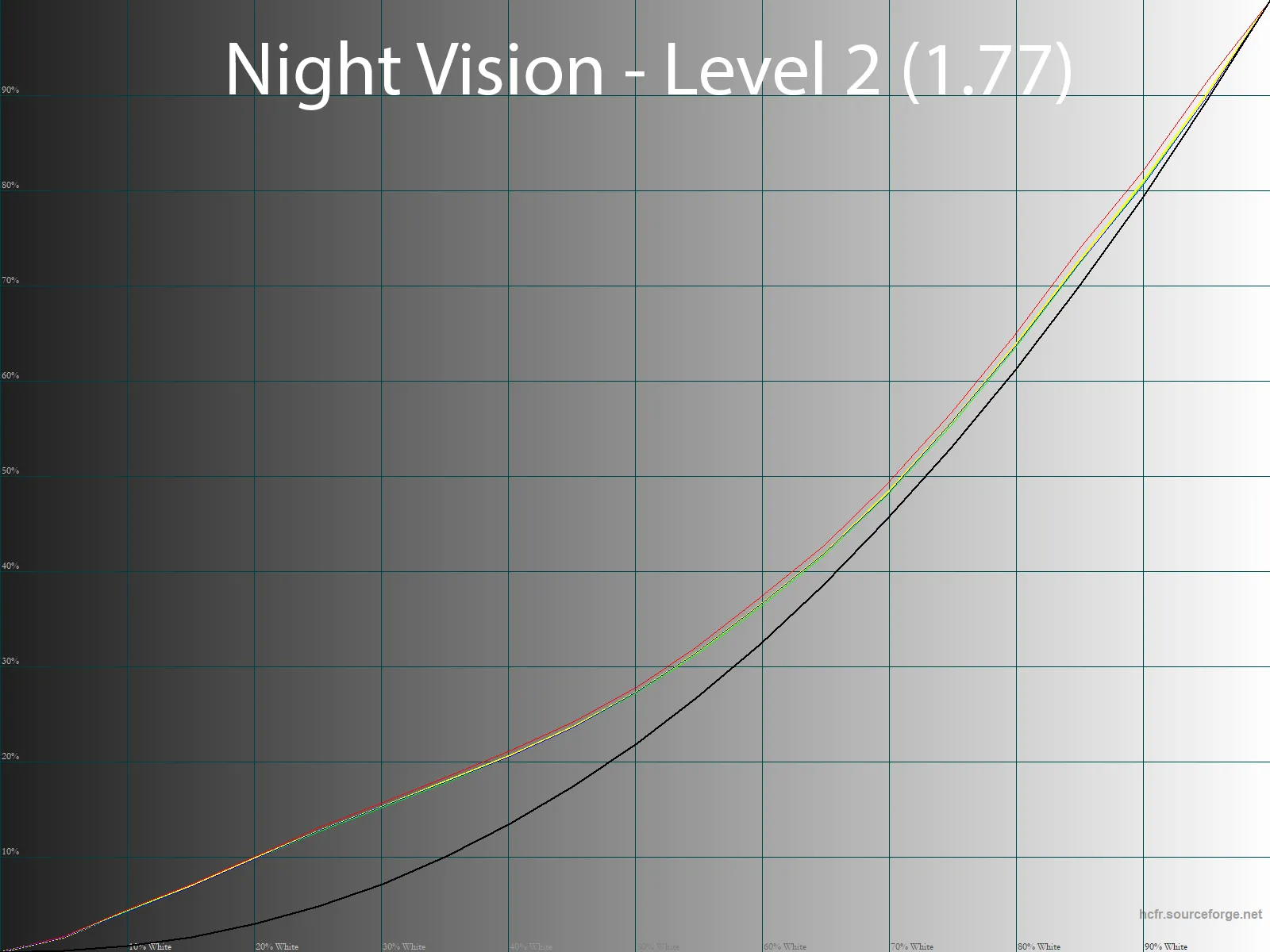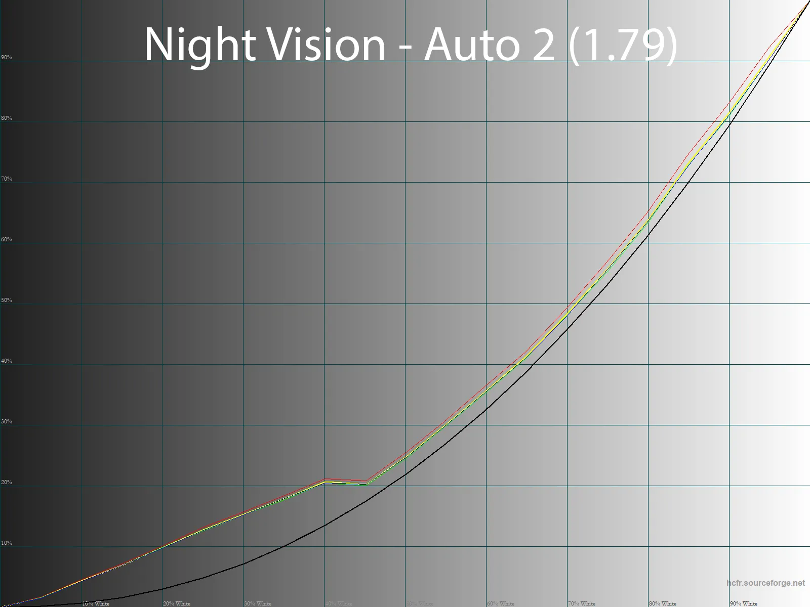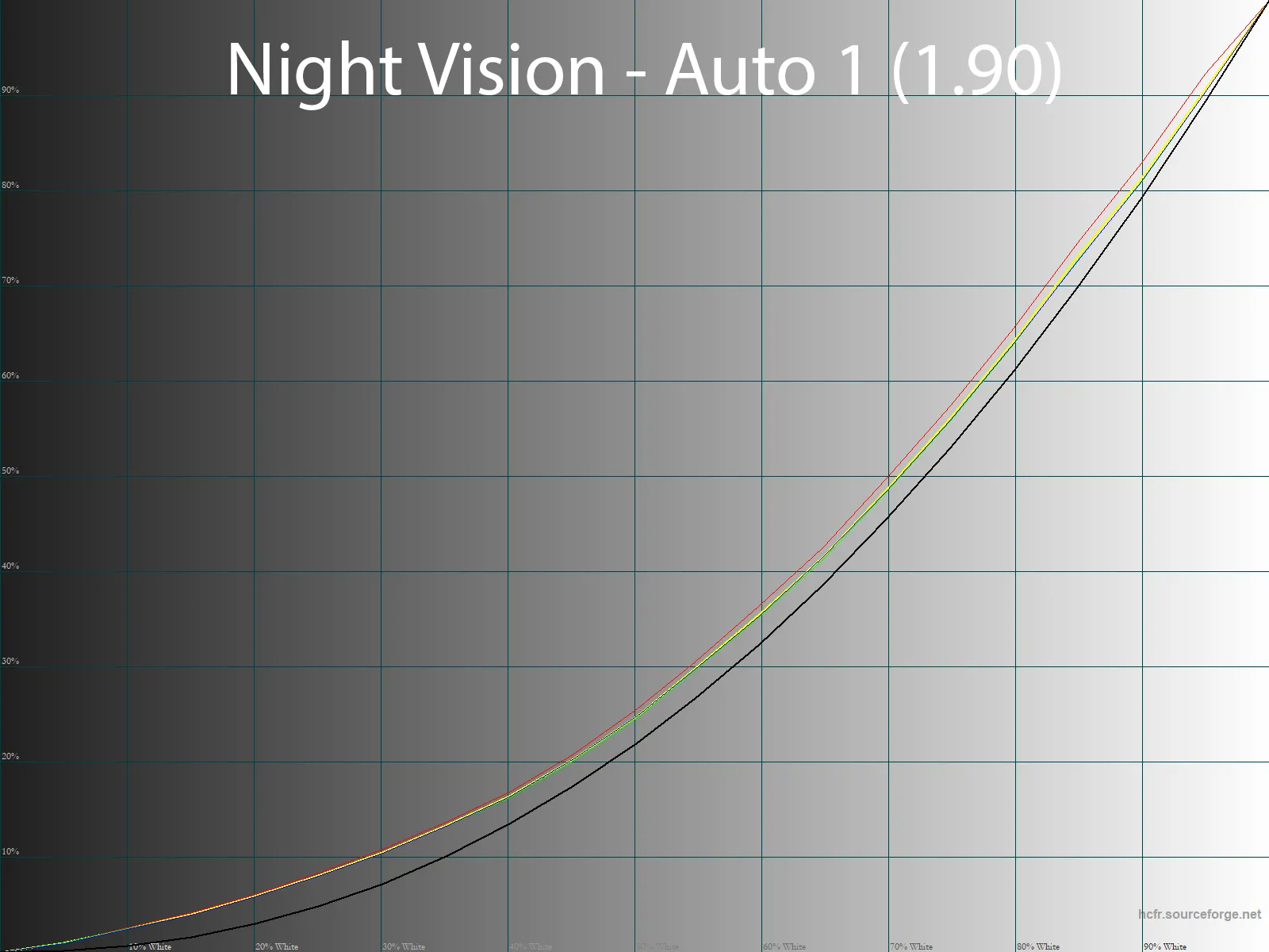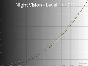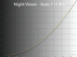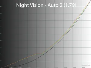 Для воздействия только на тени можно воспользоваться функцией Night Vision. В ней доступно четыре предустановки со следующими значениями: Auto 1, Auto 2, Mode 1 и Mode 2. Режимы оказались попарно похожими — Auto 1 соответствует Mode 1, а Auto 2 — Mode 2. У «единичек» плавно подняты кривые в диапазоне 0-35%, а у «двоек» подъём гораздо сильнее, с резкой ступенькой к средним полутонам. При этом во всех случаях сохраняется вполне корректный баланс RGB, что не может не радовать.