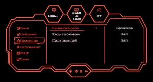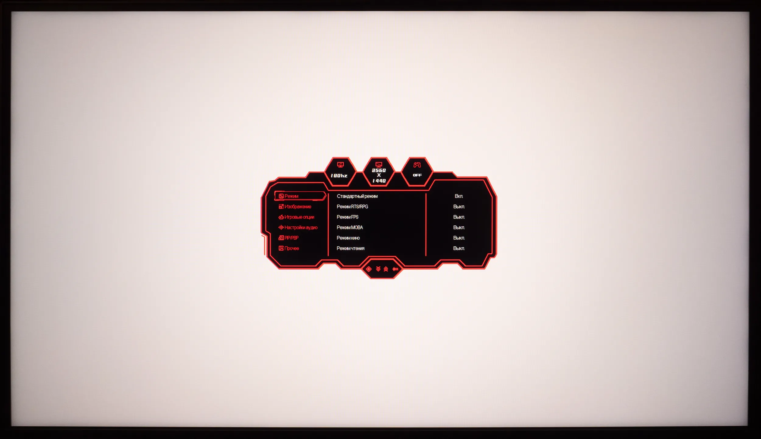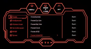 В мониторе предустановлен ряд игровых режимов, пресетов эмуляции базовых цветовых пространств с возможностью ручной настройки, а также различные вариации режимов для снижения нагрузки на глаза. Во всех случаях изменений цветового охвата происходит подмешивание компонент в чистые цвета для снижения визуальной насыщенности. В некоторых случаях это поможет обойтись без использования дополнительных цветовых профилей и облегчит жизнь перед монитором.