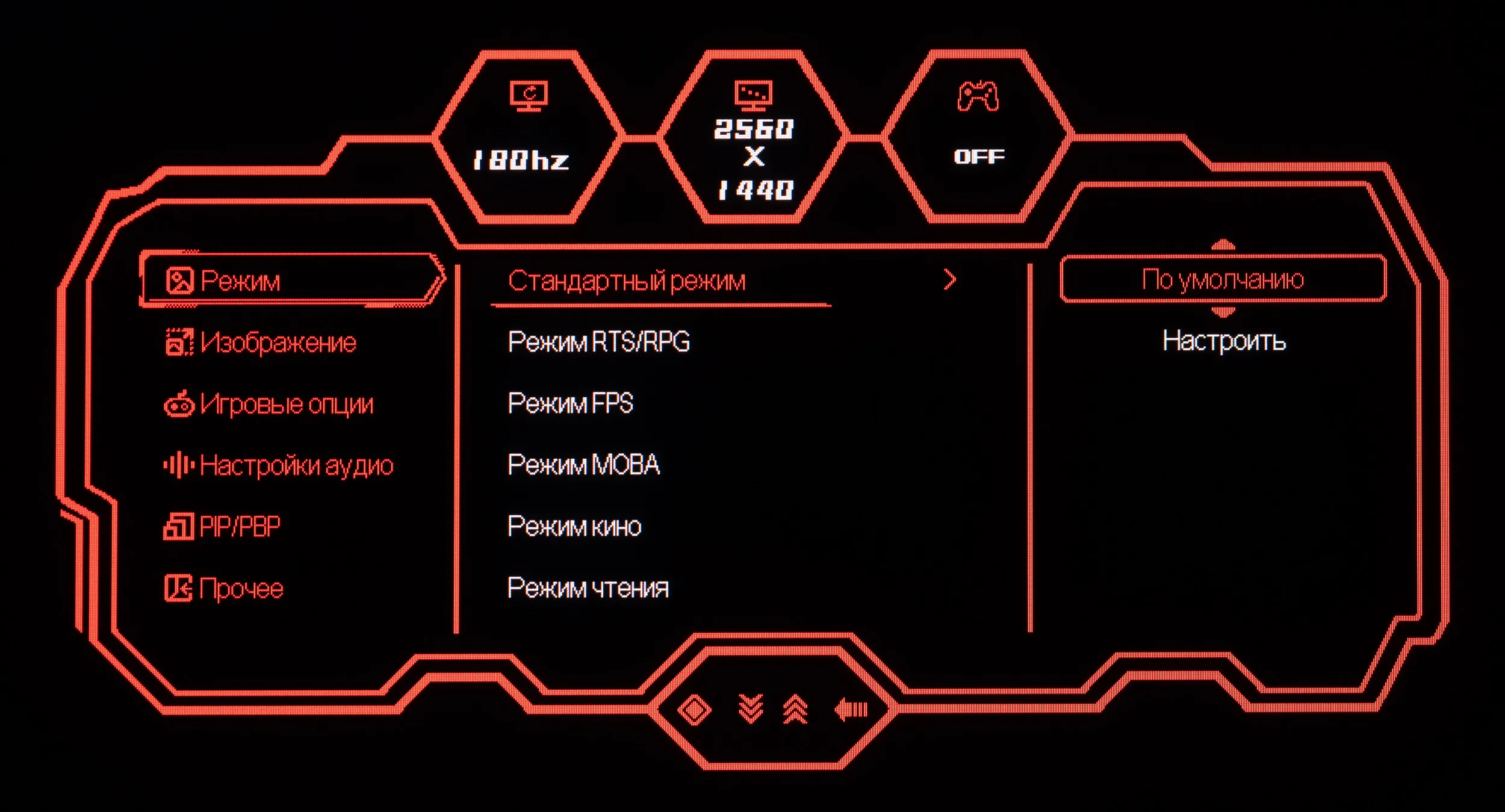 Первый раздел меню под названием «Режим» открывает доступ к предустановленным режимам изображения и позволяет проводить их детальную настройку. Одной из интересных особенностей монитора Digma Pro является возможность быстро переключаться между заводскими настройками каждого режима и внесёнными вручную изменениями. Это даёт пользователю гибкость в работе с изображением: можно экспериментировать с настройками, сохраняя возможность вернуться к оригинальным предустановкам, или же сравнить результаты своей настройки с заводскими параметрами.