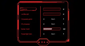 Для заботы о глазах пользователя реализованы специальные режимы: Low Blue Light снижает нагрузку на зрение за счёт уменьшения количества синего света, а Night Vision обеспечивает комфортную работу в тёмное время суток, высветляя тени (полезно и для игр). Дополнительные настройки резкости позволяют оптимизировать детализацию изображения, но повышать параметр мы строго не рекомендуем.