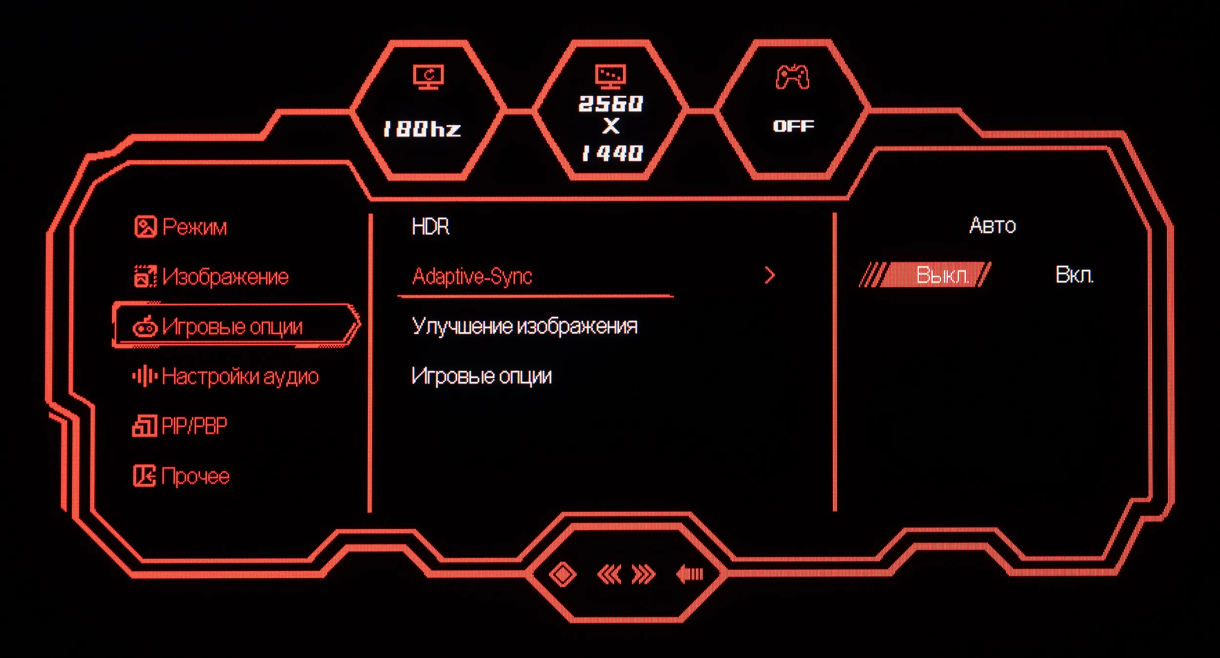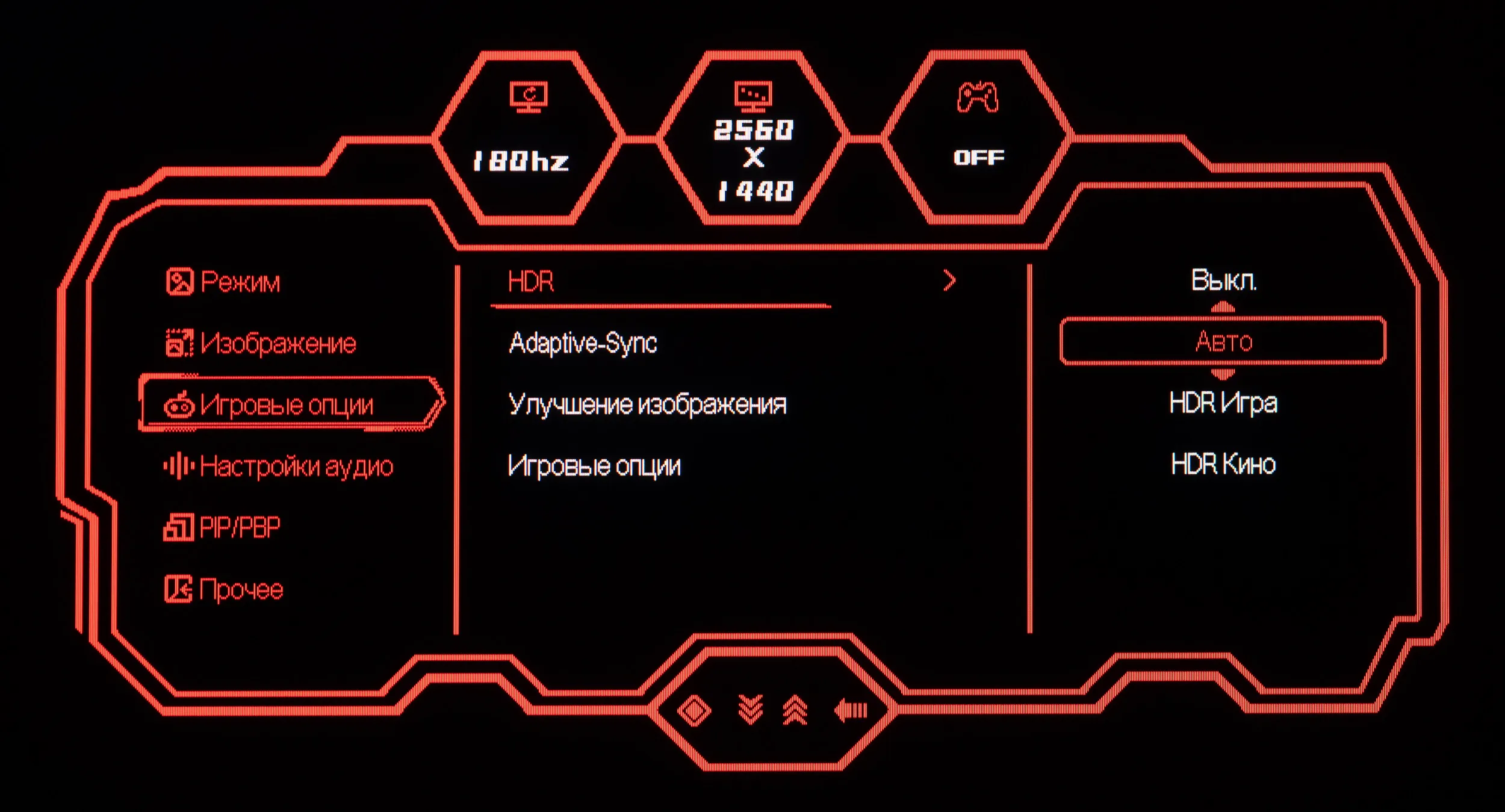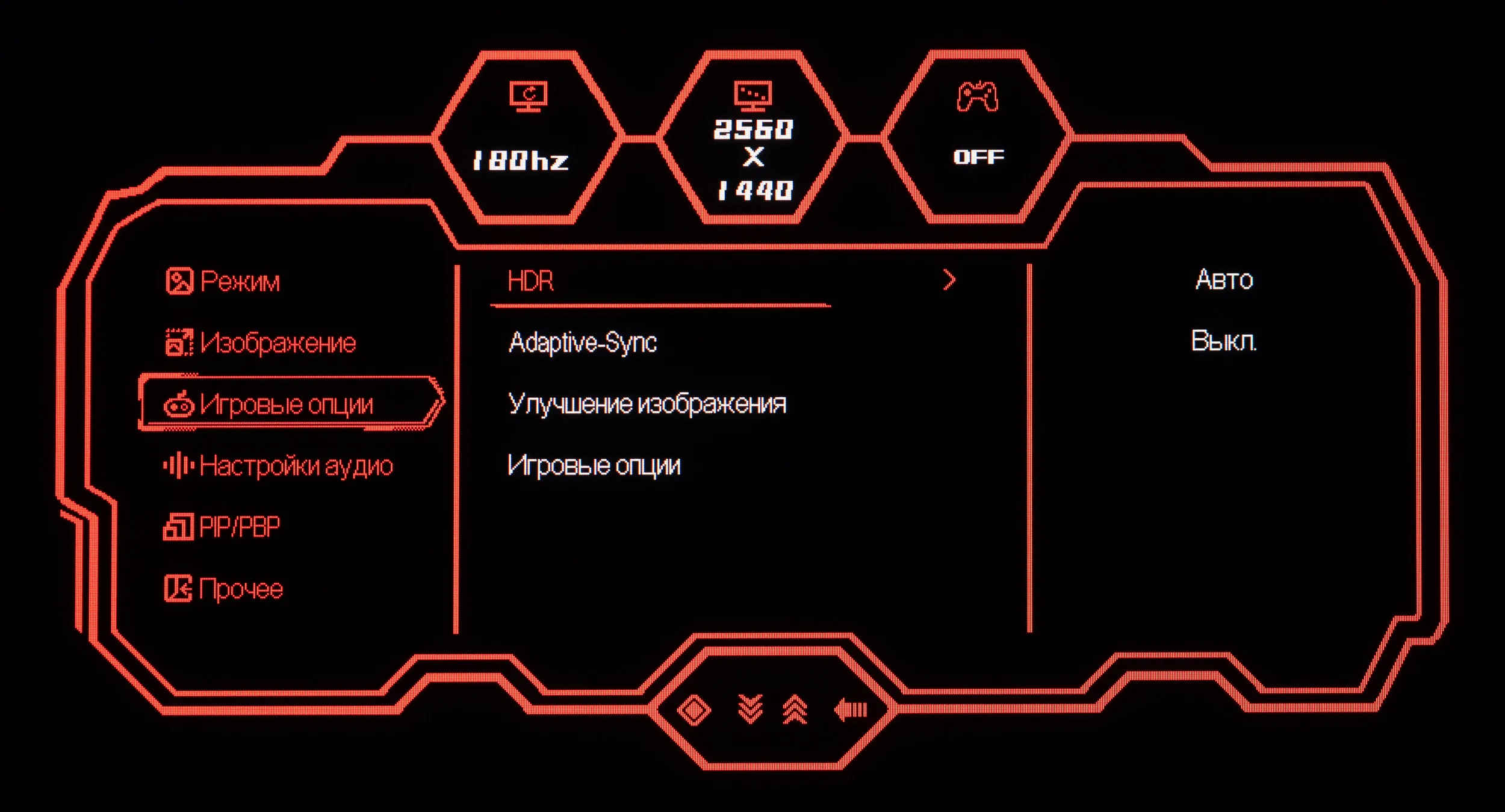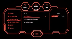 Раздел «Игровые опции» объединяет ключевые функции для оптимизации игрового процесса: настройки HDR и Adaptive-Sync для качественной картинки, а также специализированные подразделы «Улучшения изображения» и «Игровые опции» для дополнительной настройки различных параметров.