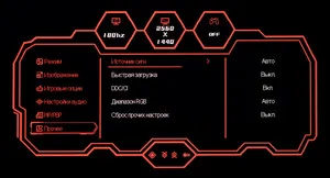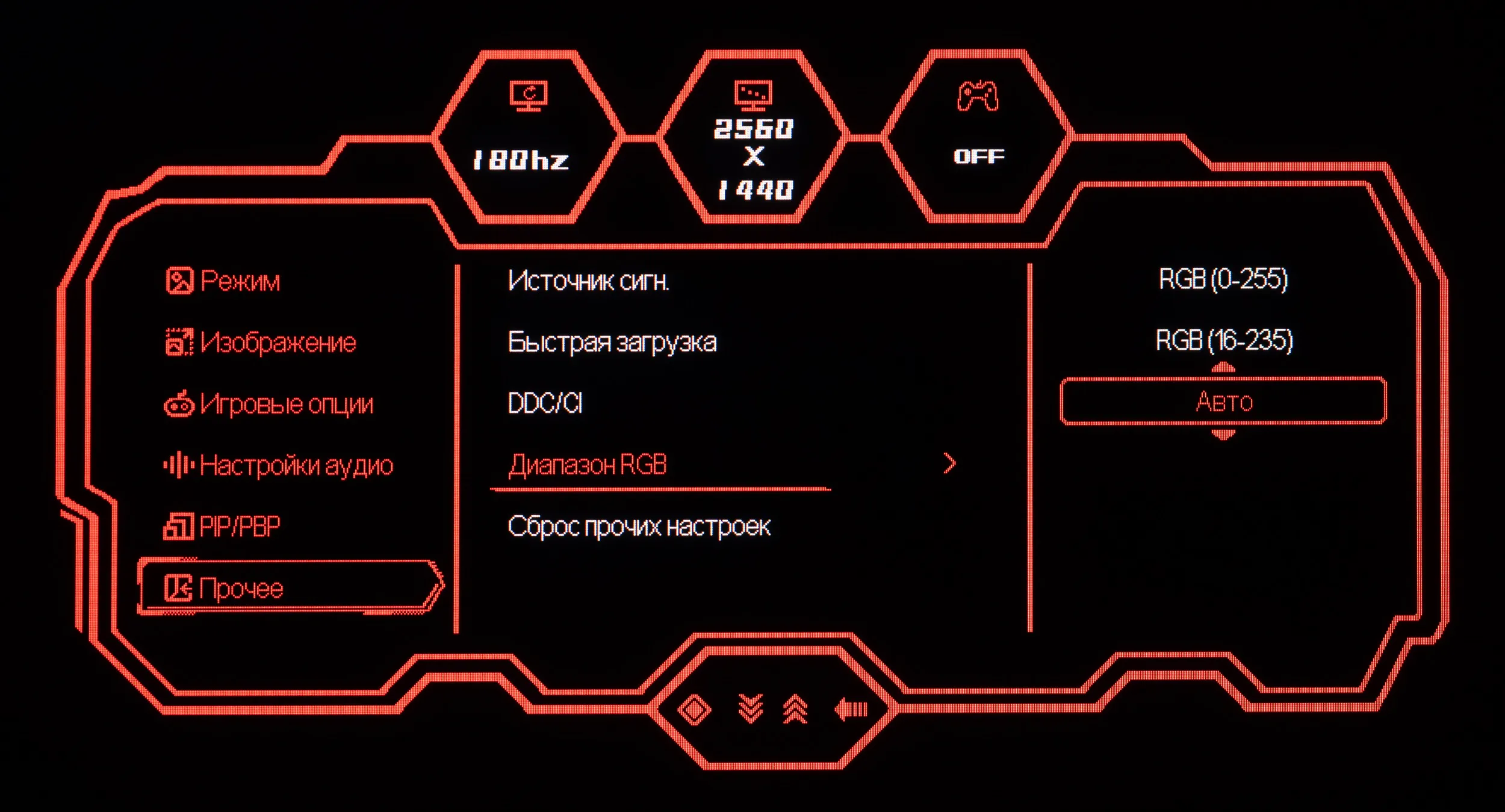В разделе «Прочее» собраны различные дополнительные настройки монитора. Здесь можно выбрать источник входного сигнала и отключить приветственную заставку для ускорения вывода изображения. Доступна регулировка диапазона RGB, есть опции для отключения поддержки DDC/CI и выполнения сброса настроек данного раздела.