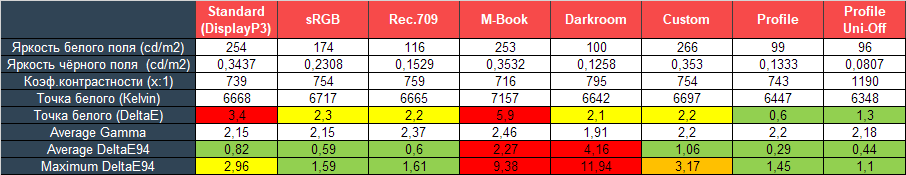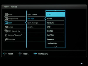 В качестве профессиональных режимов представлены пресеты эмуляции sRGB, Rec.709 и два не менее значимых пресета DCI-P3 и Display P3 (адаптация DCI-P3 под привычную гамма-кривую) с заявленной точной заводской настройкой.