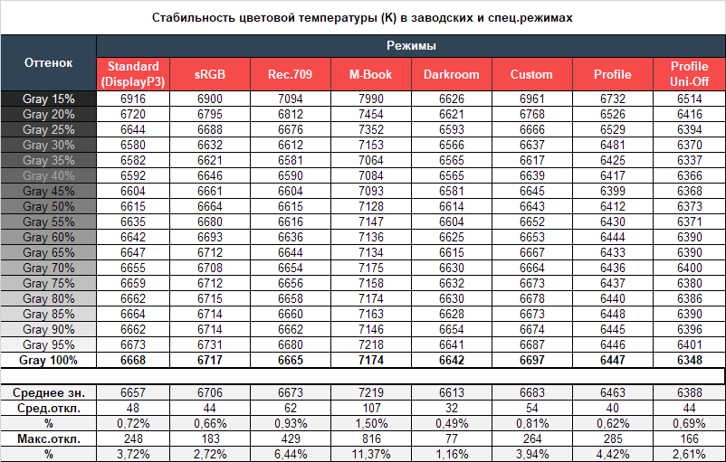 Уровень стабильности цветовой температуры в большинстве изученных режимов оказался крайне высоким. Слабину дали только два режима: M-Book и Rec.709 из-за своих максимальных отклонений. В остальном же результаты нас полностью устроили.