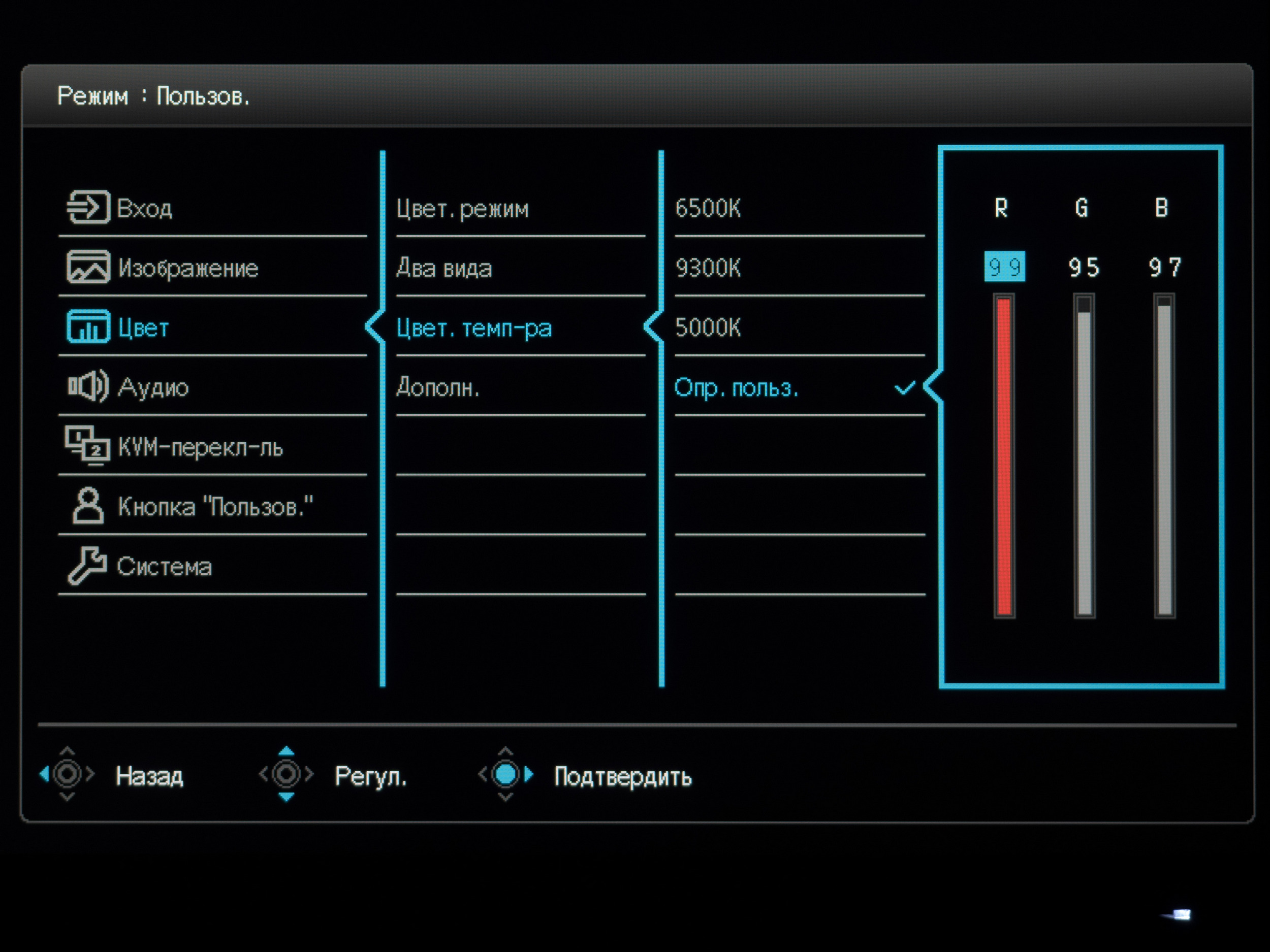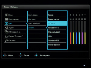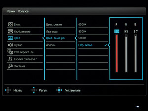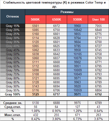 Что касается предустановленных режимов цветовой температуры, доступных лишь для некоторых пресетов изображения, то монитор смог продемонстрировать достаточно высокую точность соответствия. Отличие между измеренными и заявленными в меню значениями не превысило в среднем 100-200К и лишь в 9300К составило порядка 700К, что является допустимой нормой. Если же вам требуются минимальные отклонения в совокупности с близостью к референсным 6500К, то советуем остановить свой выбор на заводском значении (Пользователь) и не знать проблем, а при появлении возможности отрегулировать RGB значения.