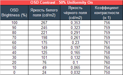 Для изучения стабильности контрастности и диапазона изменения яркости для начала был выставлен режим Standard. Значение Brightness менялось с 100 до 0% с шагом в 10 единиц. Для представленной ниже таблицы измеренные значения были получены через программу HCFR, которая даёт возможность более точно оценить уровень чёрного (три знака после запятой) и соответственно определить достоверный коэффициент контрастности.