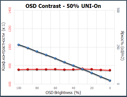При тестировании мы проверили поведение монитора как с активированной системой компенсации неравномерности, так и без неё. Полученный рабочий диапазон яркости при стандартных настройках (Равномерность – Вкл.) составил 24-267 нит при коэффициенте контрастности в ~760:1 в среднем. Снижение яркости линейно во всём диапазоне, коэффициент контрастности стабилен, но ниже заявленного в ТХ на 35 %.
