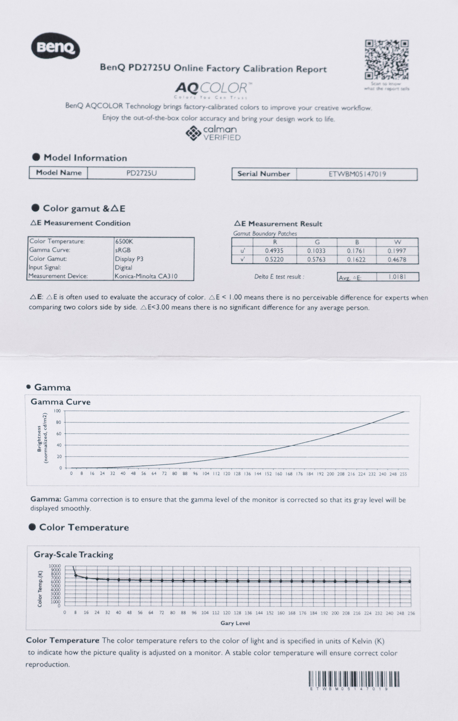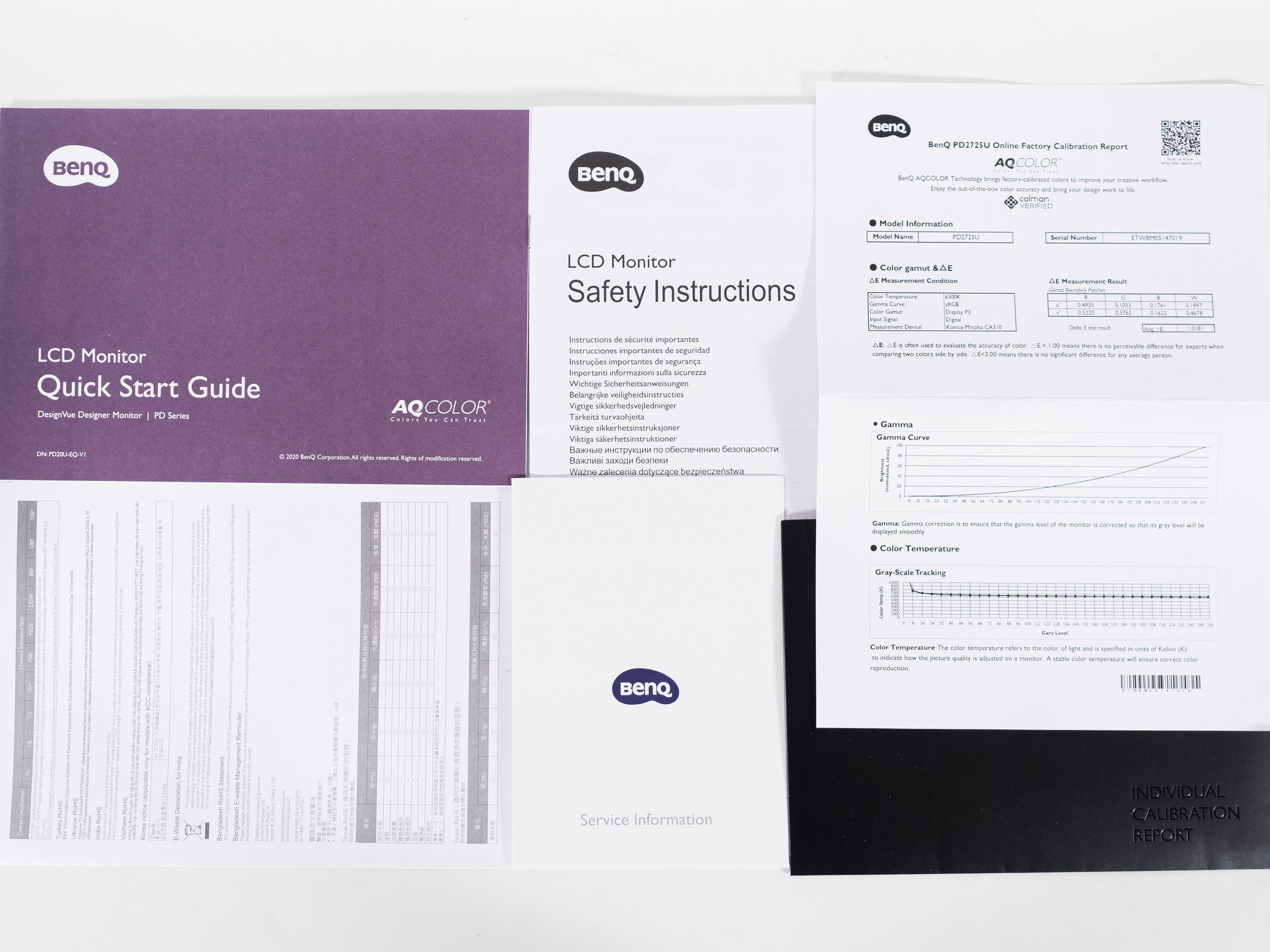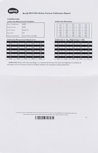 Отчёт о проведённой заводской калибровке находится в элегантном чёрном конверте. Перед покупателем будет представлен лист формата А5 с результатами точности цветопередачи в неизвестном режиме (предполагаем, что им является Display P3 выставленный по умолчанию), при цифровом подключении, с активированной гаммой sRGB и цветовым охватом Display P3. Утверждать, что каждый экземпляр подвергается индивидуальной настройке, мы не будем, а вот то, что BenQ использует выборку наиболее удачных и стабильных по качеству матриц – вполне вероятно, о чём они и говорят в описании монитора, обещая максимально схожую цветопередачу у разных экземпляров.