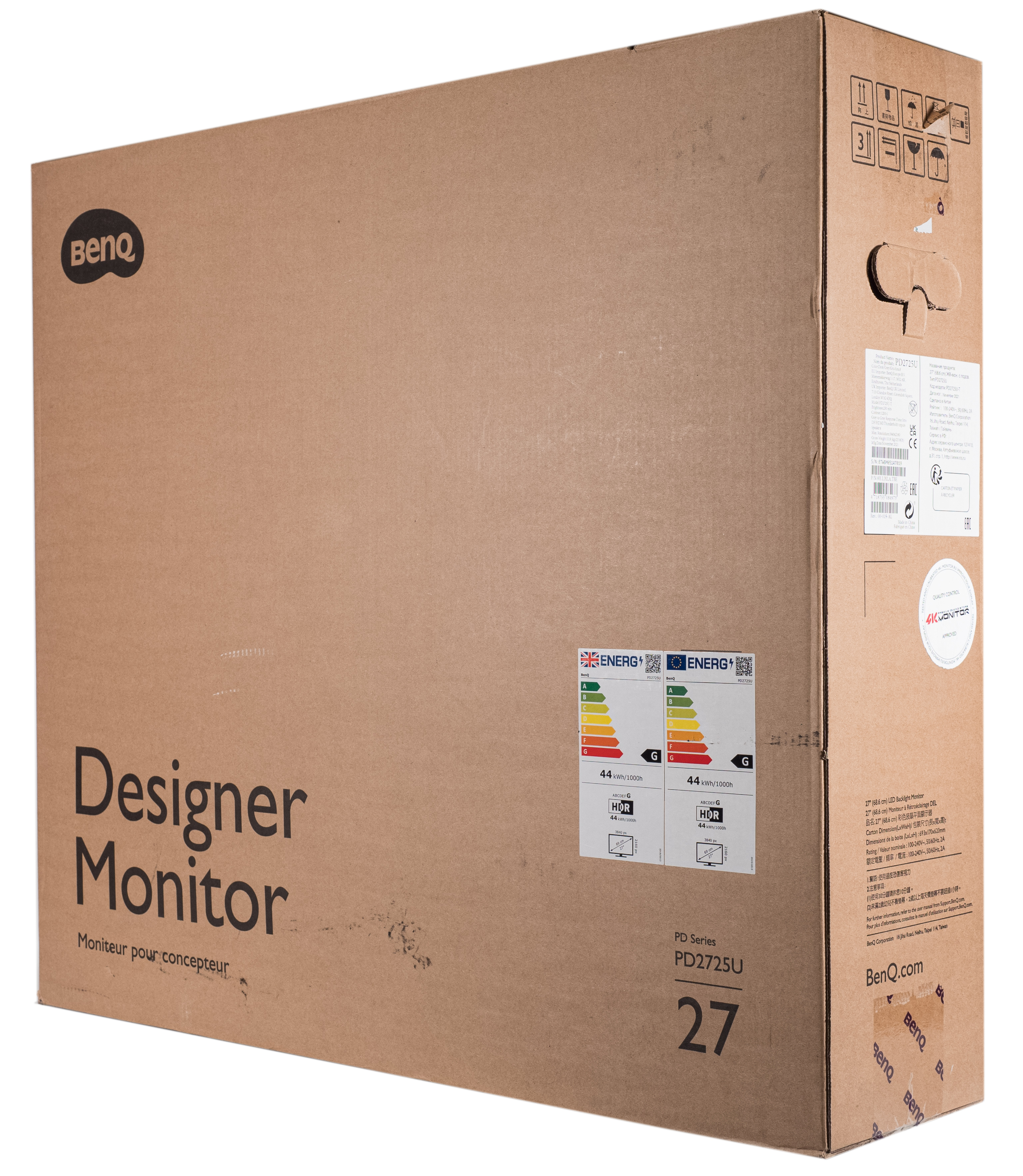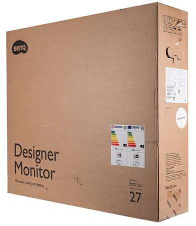 Монитор BenQ PD2725U поставляется в крупной коробке с упрощённым дизайном – нет ни фотографии, ни перечисления особенностей модели. Пластиковая ручка для переноски отсутствует — лишь вырезы в картоне с двух сторон.