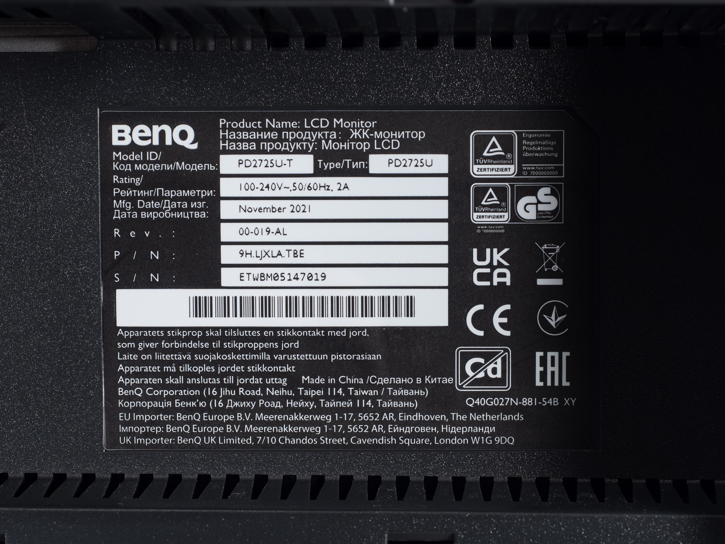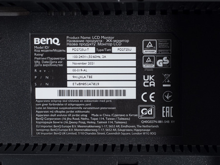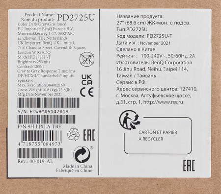Наклейка на коробке содержит информацию об основных технических характеристиках дисплея. Также указана дата (ноябрь 2021 года) и место производства (Китай). Версия нашего экземпляра – 00-019-AL.