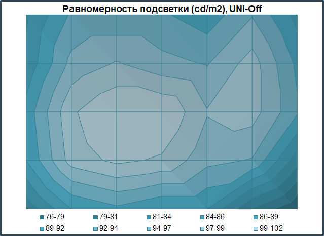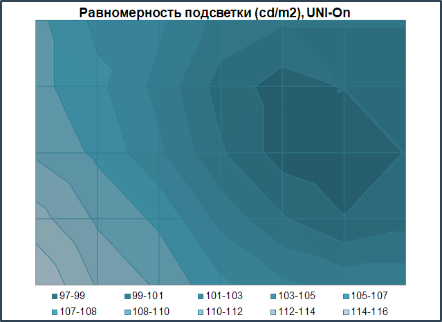 Равномерность подсветки монитора и цветовой температуры по полю экрана проверялась в 35 точках при установленной яркости монитора в 100 нит. За основу всех подсчётов (отклонений) брались данные из центральной точки. Система компенсации неравномерности подсветки в мониторе применяется и активирована по умолчанию, что для дисплея данного ценового сегмента – в порядке нормы.