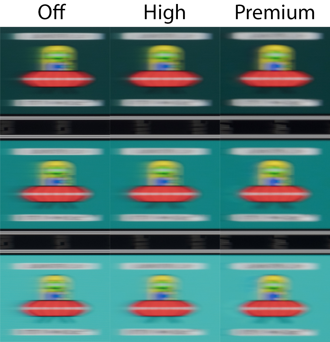 В новинке заявлена матрица со временем отклика в 5 мс, измеренным по методике Gray-to-Gray. По умолчанию установлено значение AMA – High. Всего же их, как и у большинства моделей BenQ, три доступных варианта. Сравним их между собой: