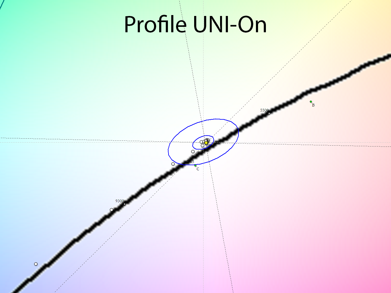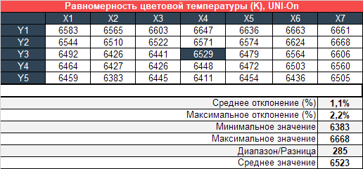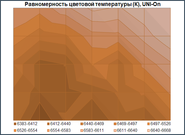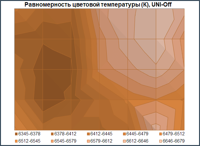 Теперь перейдём к рассмотрению равномерности цветовой температуры на всей площади экрана и повторим тестирование с выключенной и включённой системой компенсации неравномерности.