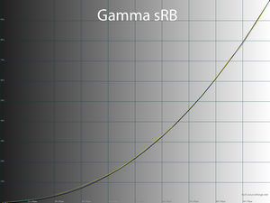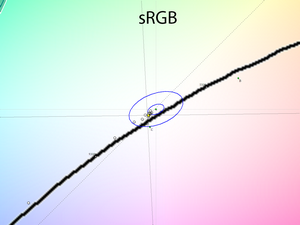 При стандартных настройках и в режиме Пользователь при настройках по умолчанию гамма-кривые проходят точно в соответствии с указанной производителем гаммой sRGB. При этом разброс между RGB каналами небольшой, что обеспечивает достаточно высокую стабильность оттенков серого, частично и плотной группой лежащих в зоне DeltaE<3.