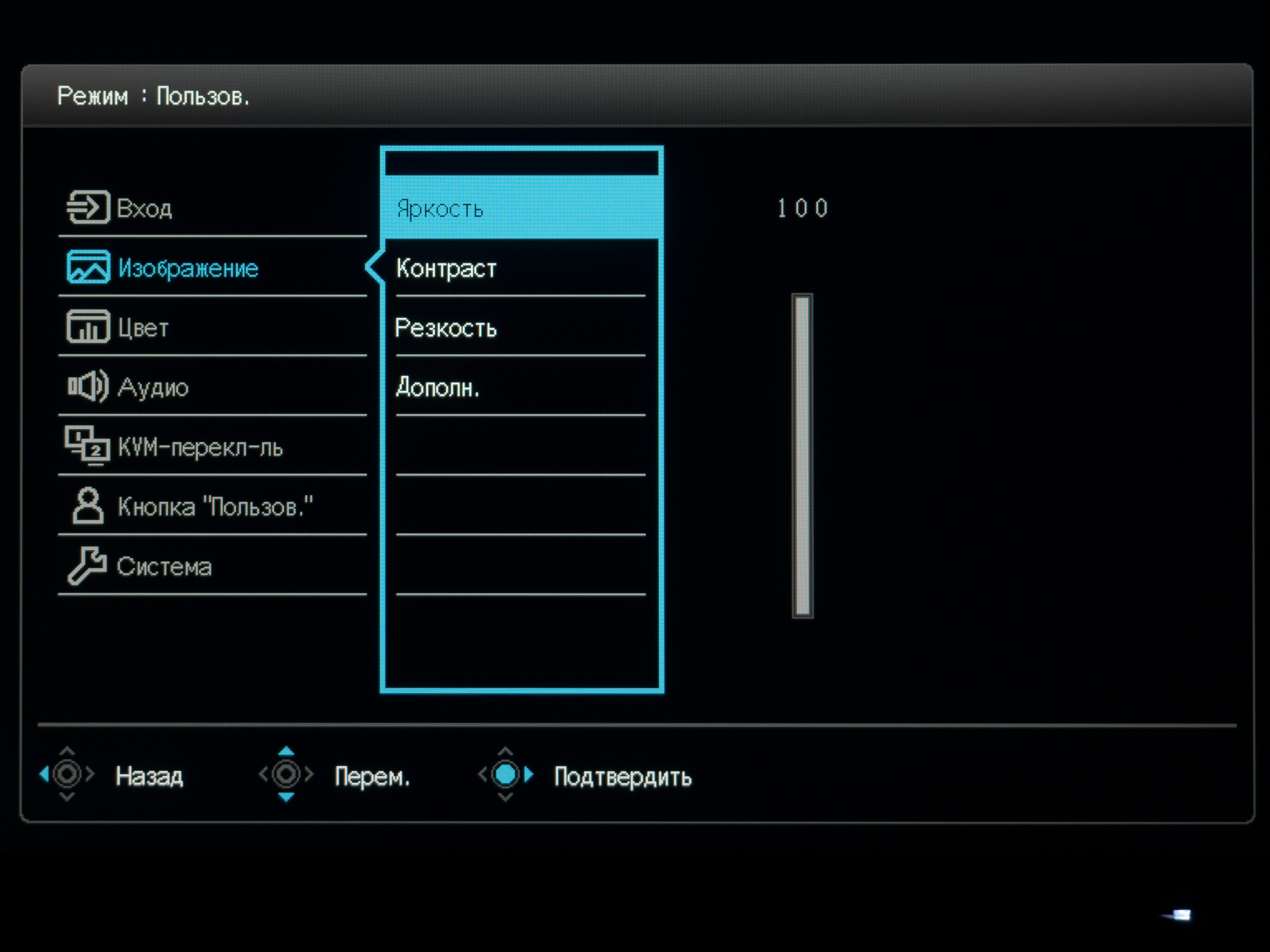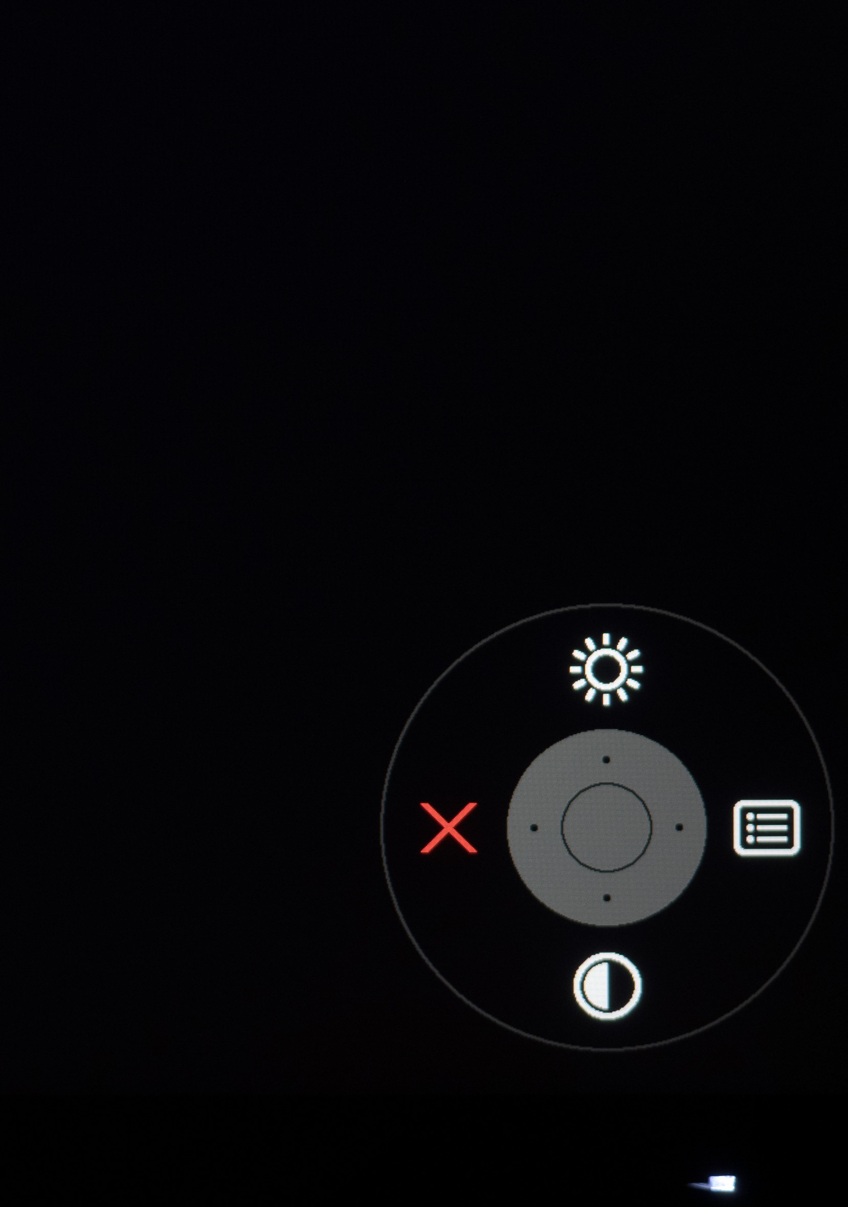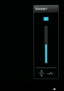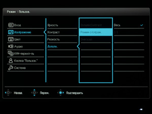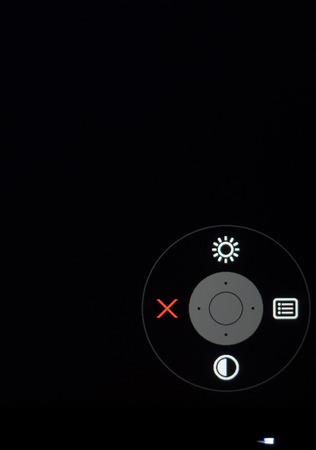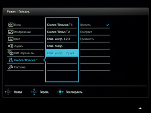 При нажатии на джойстик на экран выводится навигационный блок меню. По умолчанию можно быстро перейти к настройкам яркости и контрастности, убрать навигационный блок и перейти к основному меню. Две физические клавиши предоставляют быстрый доступ к трём выбранным режимам и интерфейсам подключения. В настройках пользователь может сам выбрать необходимые пункты для различных функций с быстрым доступом.