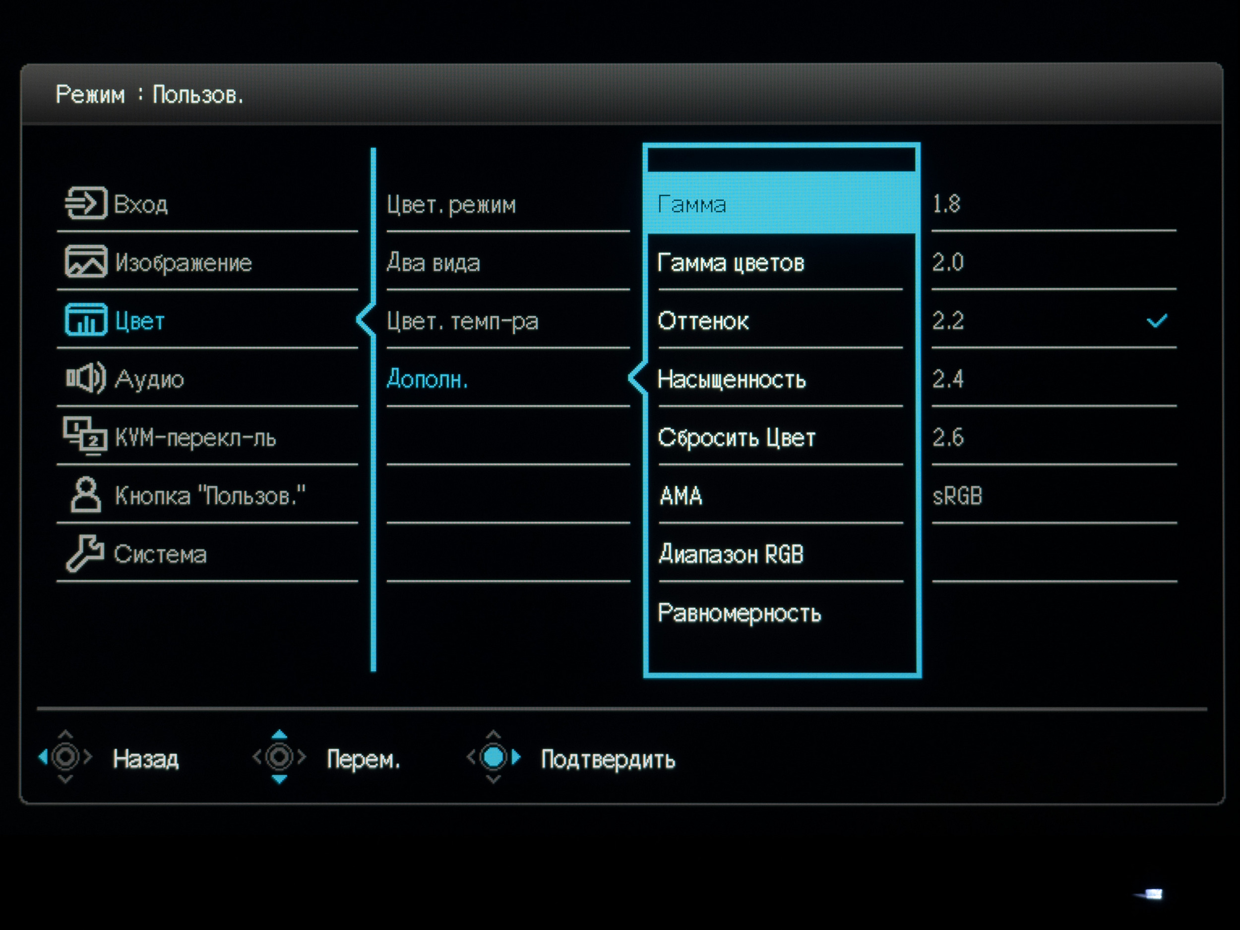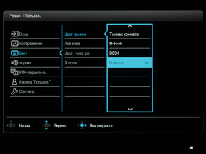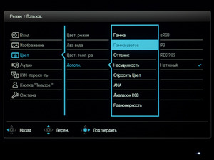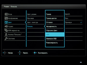 В следующем разделе основная часть цветовых настроек (в частности пресеты эмуляции цветовых пространств) доступна лишь в пользовательском режиме (User). Также в нём можно выбрать один из оставшихся режимов Picture Mode, активировать DualView с выбором второго режима отображения, установить цветовую температуру (есть три предустановки и ручной пресет) и степень разгона панели и многое другое.