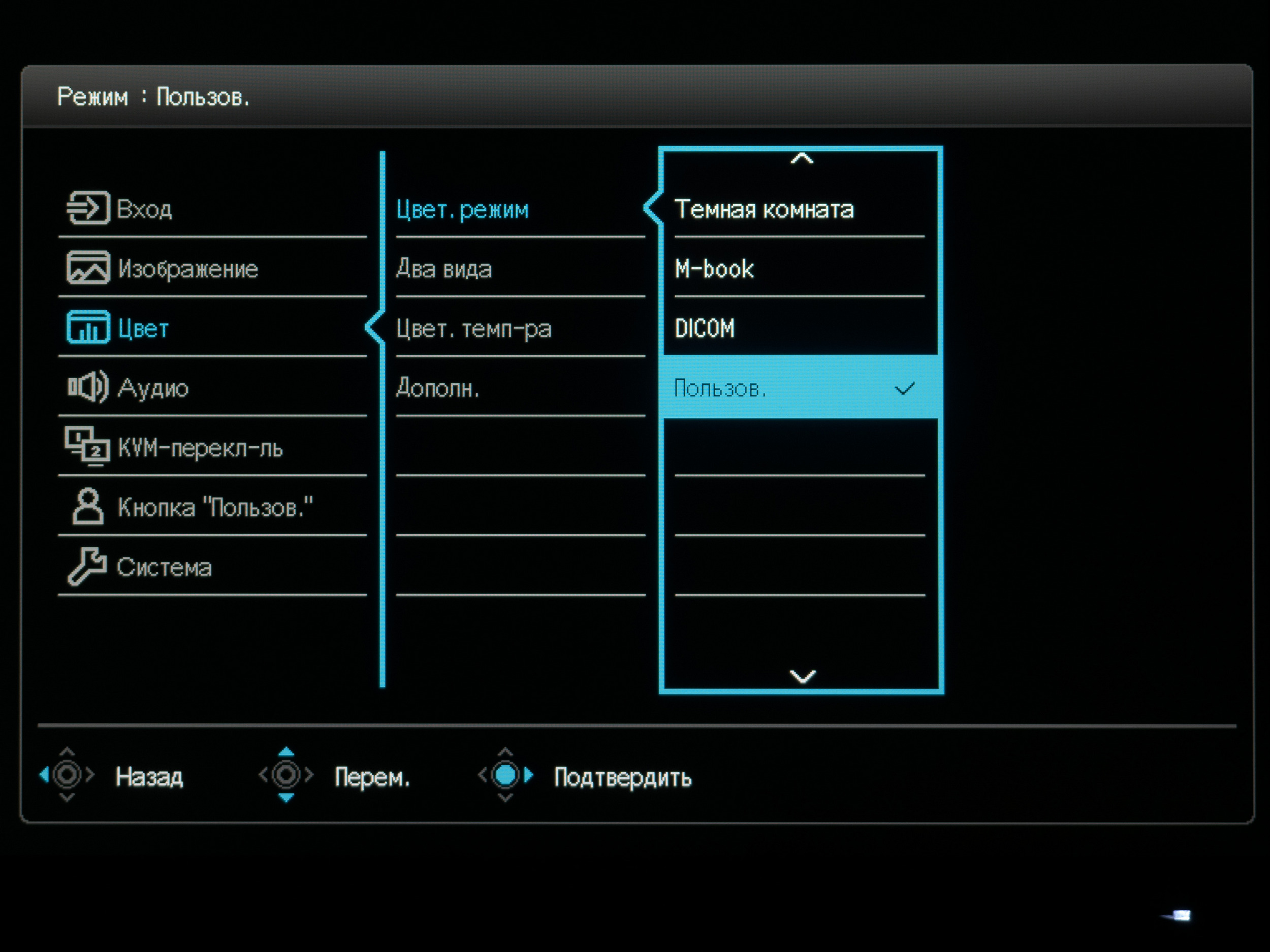 В мониторе PD2725U присутствует знакомые нам специальные предустановленные режимы CAD/CAM и Animation, усиливающие контрастность картинки для более комфортной работы с тонкими линиями и для их лучшей проработки. Для специалистов в области КТ и МРТ предназначен DICOM Mode; для работы при плохом освещении предлагается использовать Darkroom Mode (режим «Тёмной комнаты») с уменьшенными яркостью и визуальной контрастностью для лучшей различимости крайних тёмных оттенков и меньшей нагрузки на глаза, а M-Book пытается эмулировать картинку экранов современных MacBook от Apple (это мы ещё проверим).