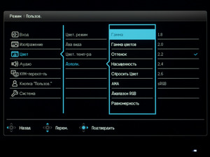 У новинки BenQ нет каких-либо встроенных датчиков (освещенности, приближения), но в меню есть много параметров, которые могли бы дополнительно повлиять на точность цветопередачи. С частью из них мы уже столкнулись при рассмотрении режимов выше, часть считаем абсолютно бесполезной для точной работы с цветом (это мы про 6-осевые коррекции по оттенку и насыщенности), а вот различные предустановки гаммы, отвечающие за контрастность картинки, мы всё же рассмотрим: