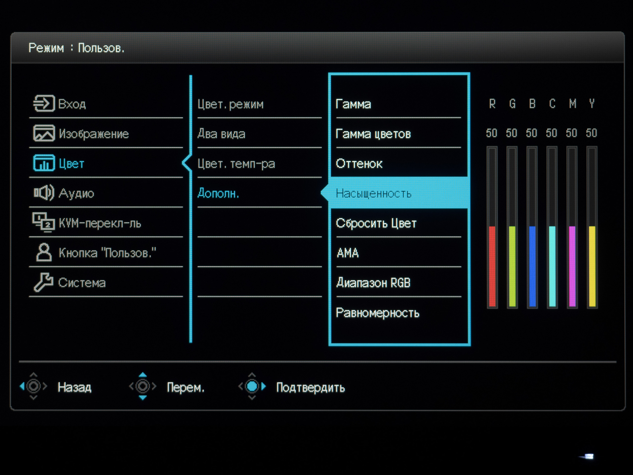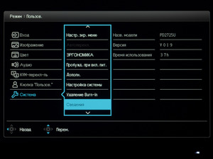 Кроме того, можно посмотреть основную рабочую информацию, вывести цветовые настройки и сбросить все параметры к значениям по умолчанию.