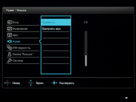 Установить уровень громкости встроенной акустической системы или выключить звук полностью предлагается в четвёртом разделе с соответствующим названием.