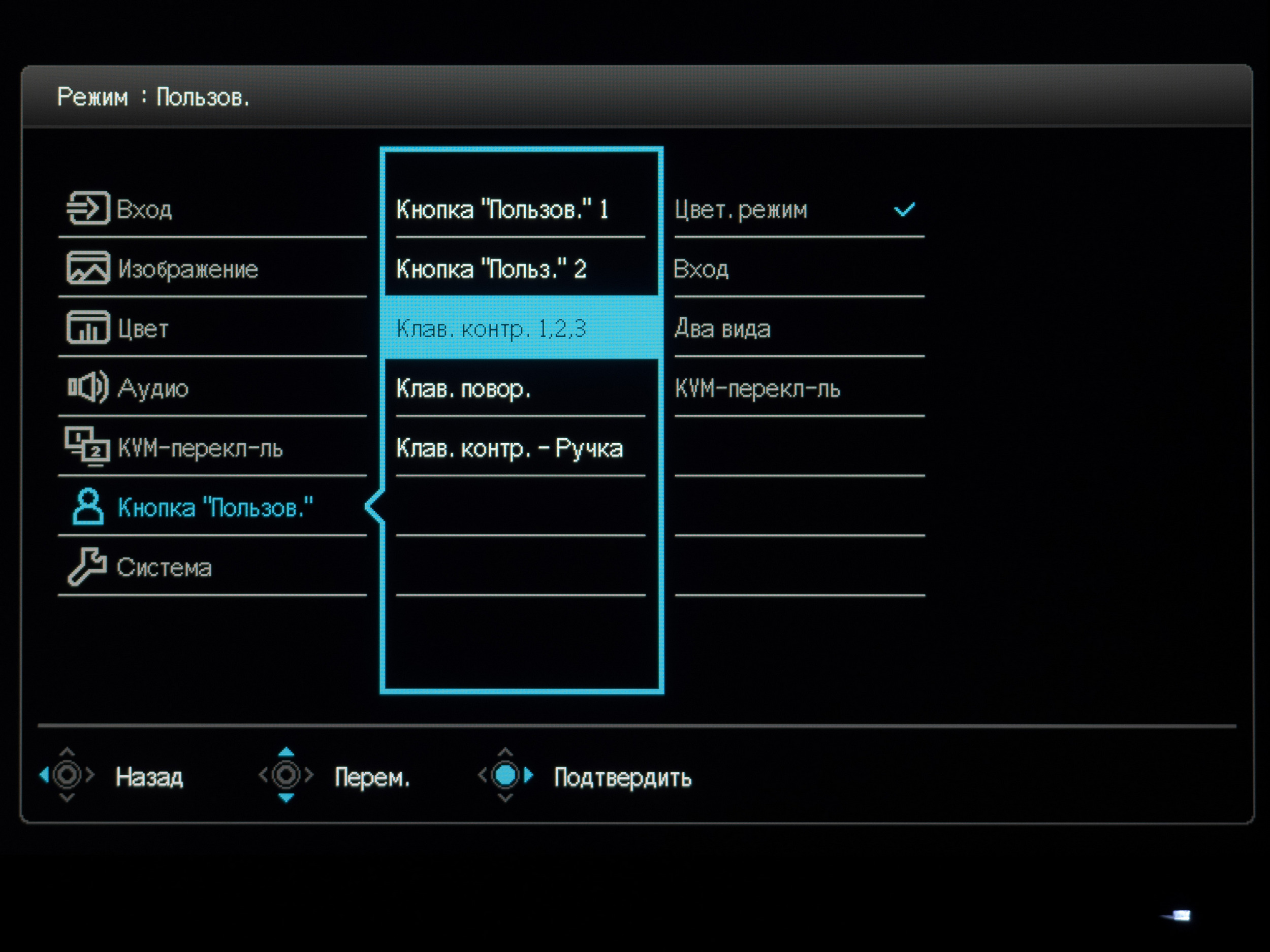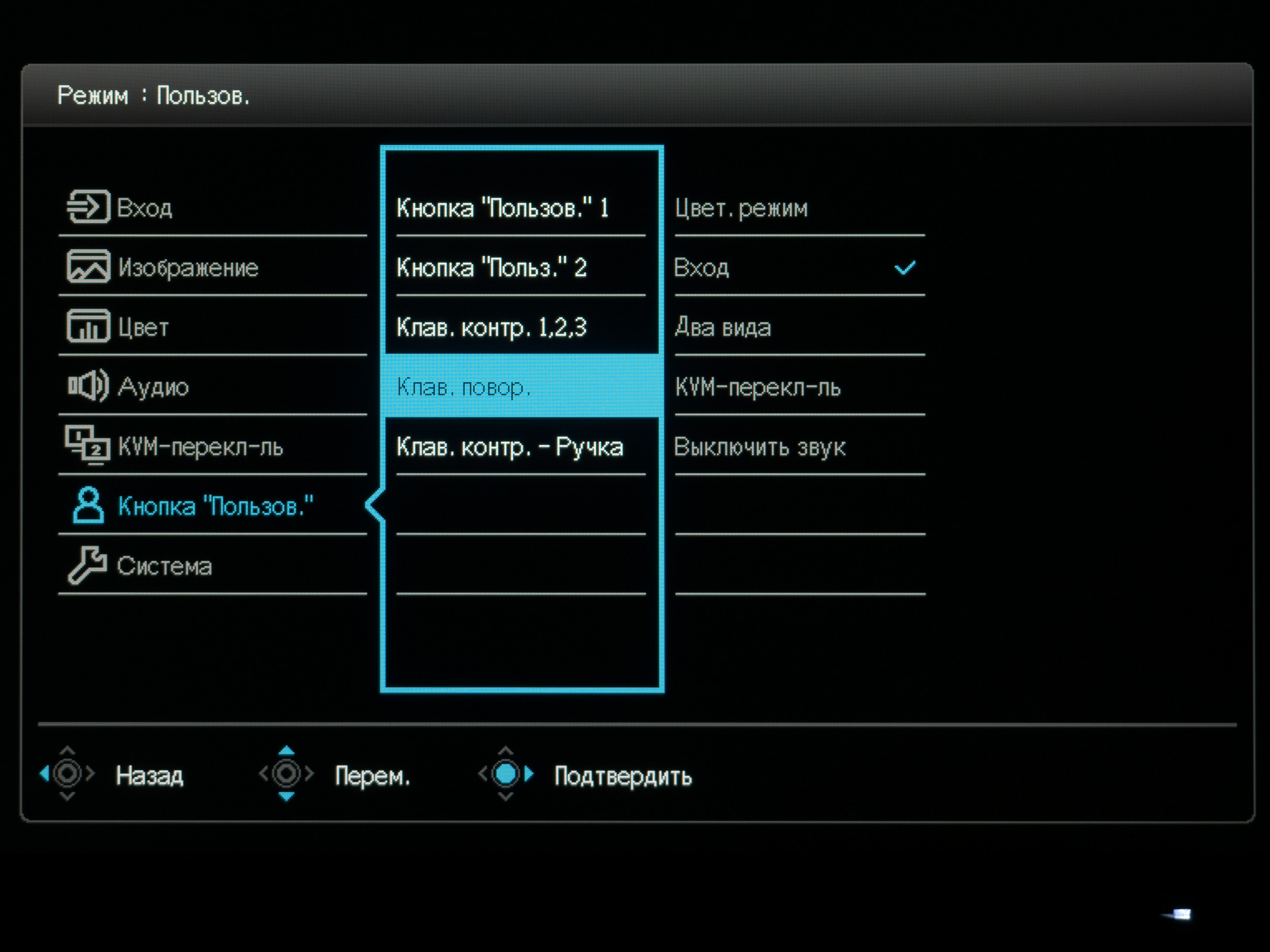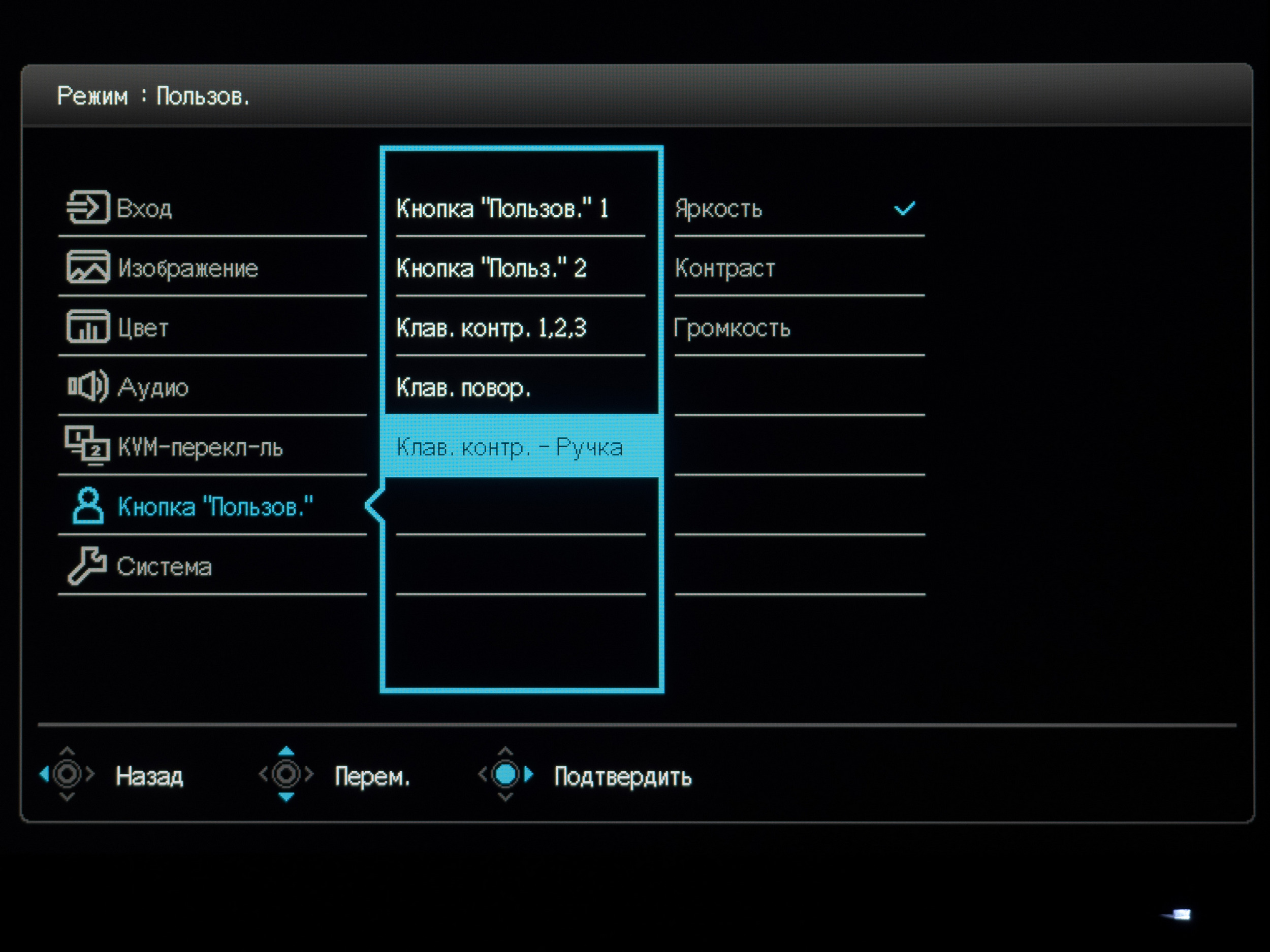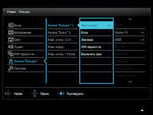 В Custom Key («Кнопка Пользователя») пользователь может выбрать функции клавиш быстрого доступа на корпусе монитора и на дополнительном блоке управления. Выбор достаточно широкий, каждый точно подберёт себе оптимальный вариант.