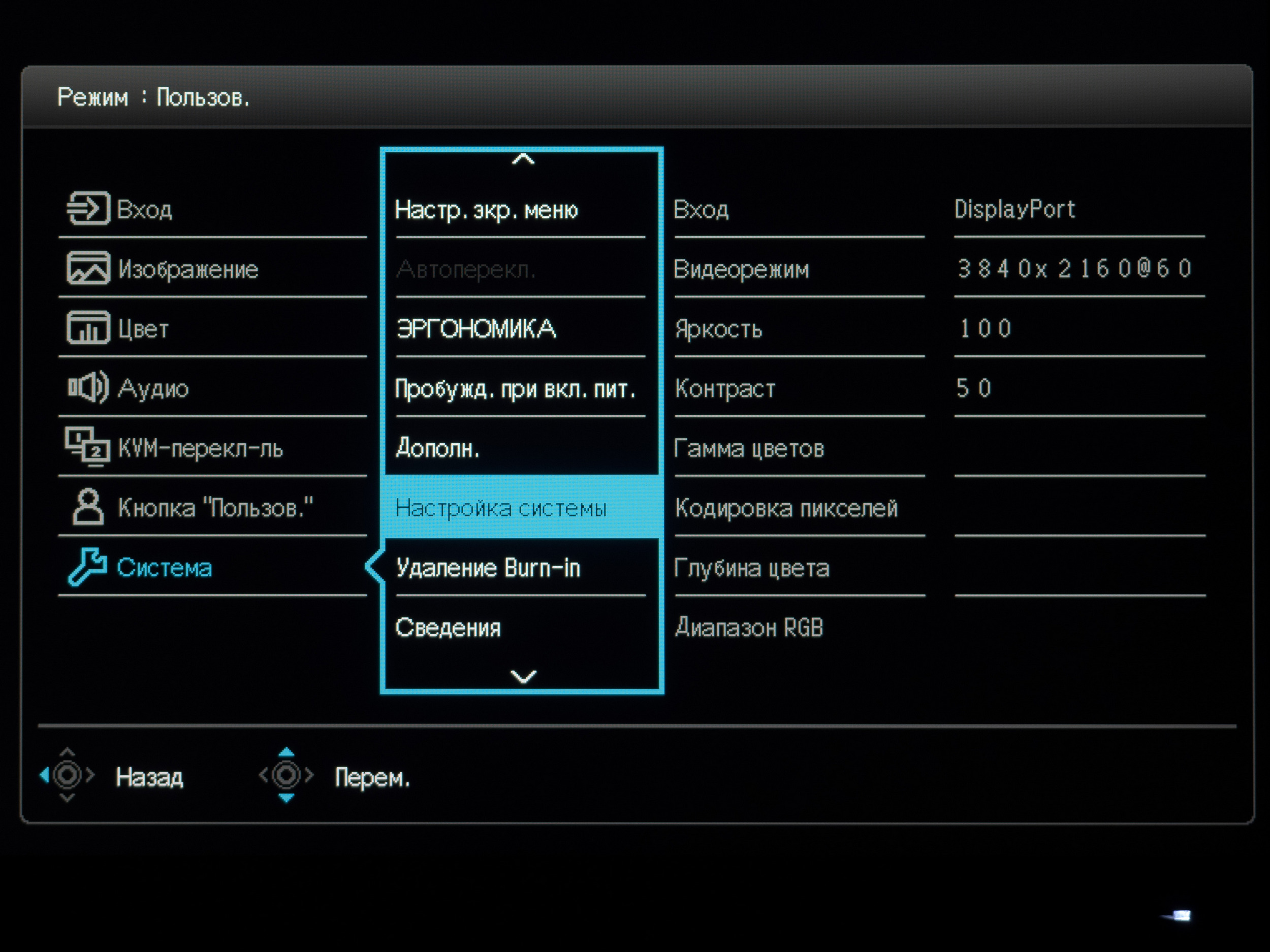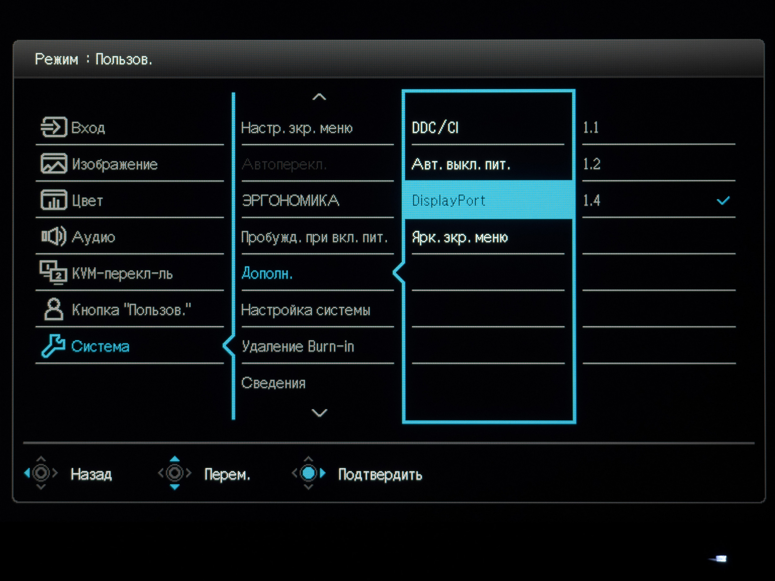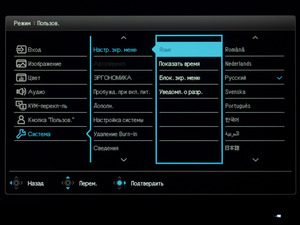 Раздел System (Система) предлагает выставить язык локализации меню (присутствует русский с, как вы могли заметить, адекватным переводом), настроить режимы работы интерфейсов, выключить DDC/CI, активировать автоматическое выключение питания и настроить напоминания о необходимости делать перерывы в работе.