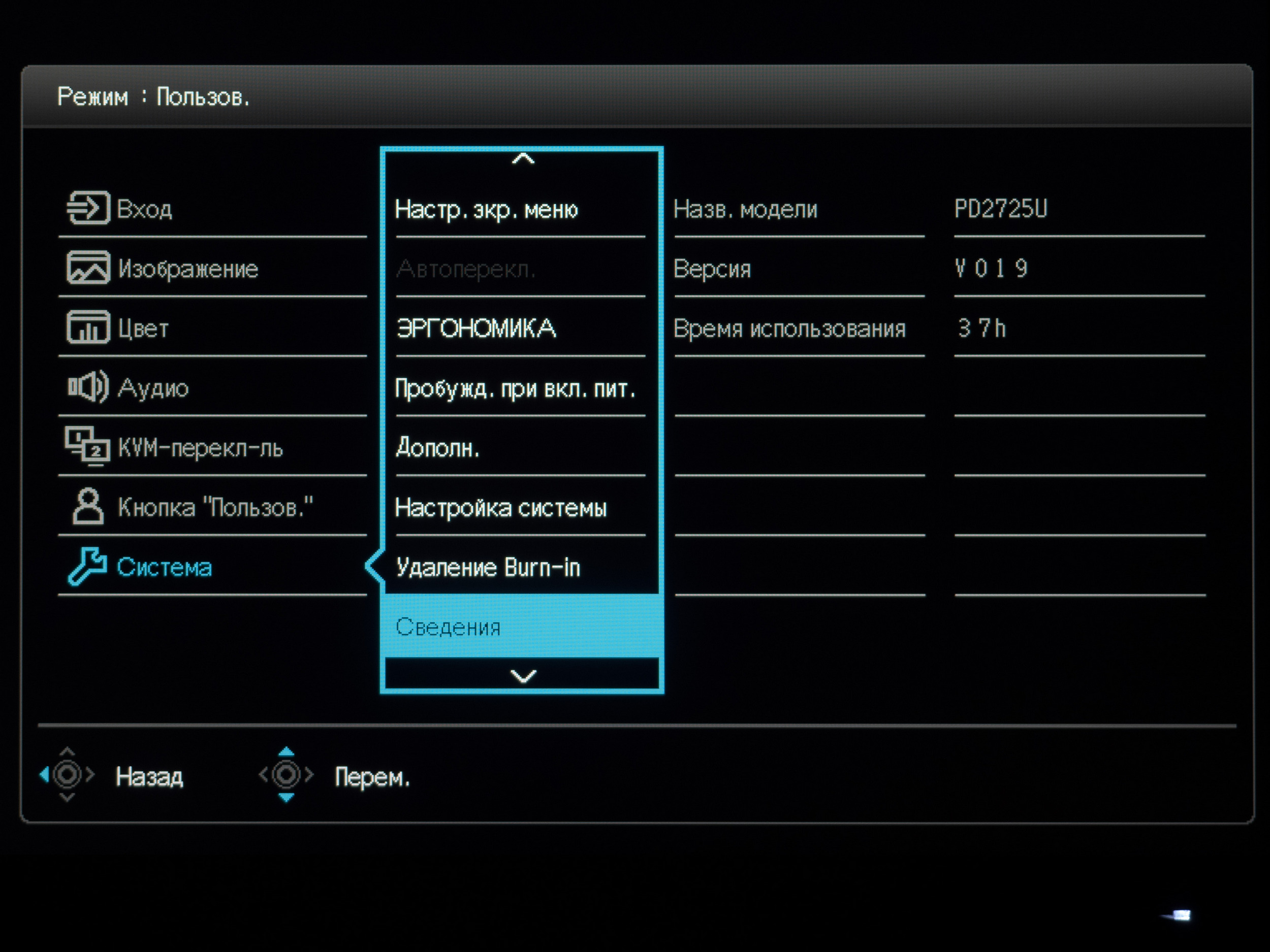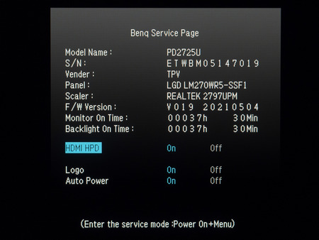 Для доступа в сервисное меню необходимо перевести пятипозиционный джойстик в положение «вправо» в момент включения монитора. Таким образом мы смогли подтвердить модель используемой в BenQ PD2725U матрицы, узнали версии встроенного скалера и прошивки, а также время наработки. Очевидно, что обычному пользователю здесь делать нечего, разве что проверить время работы у бывшего в употреблении экземпляра.