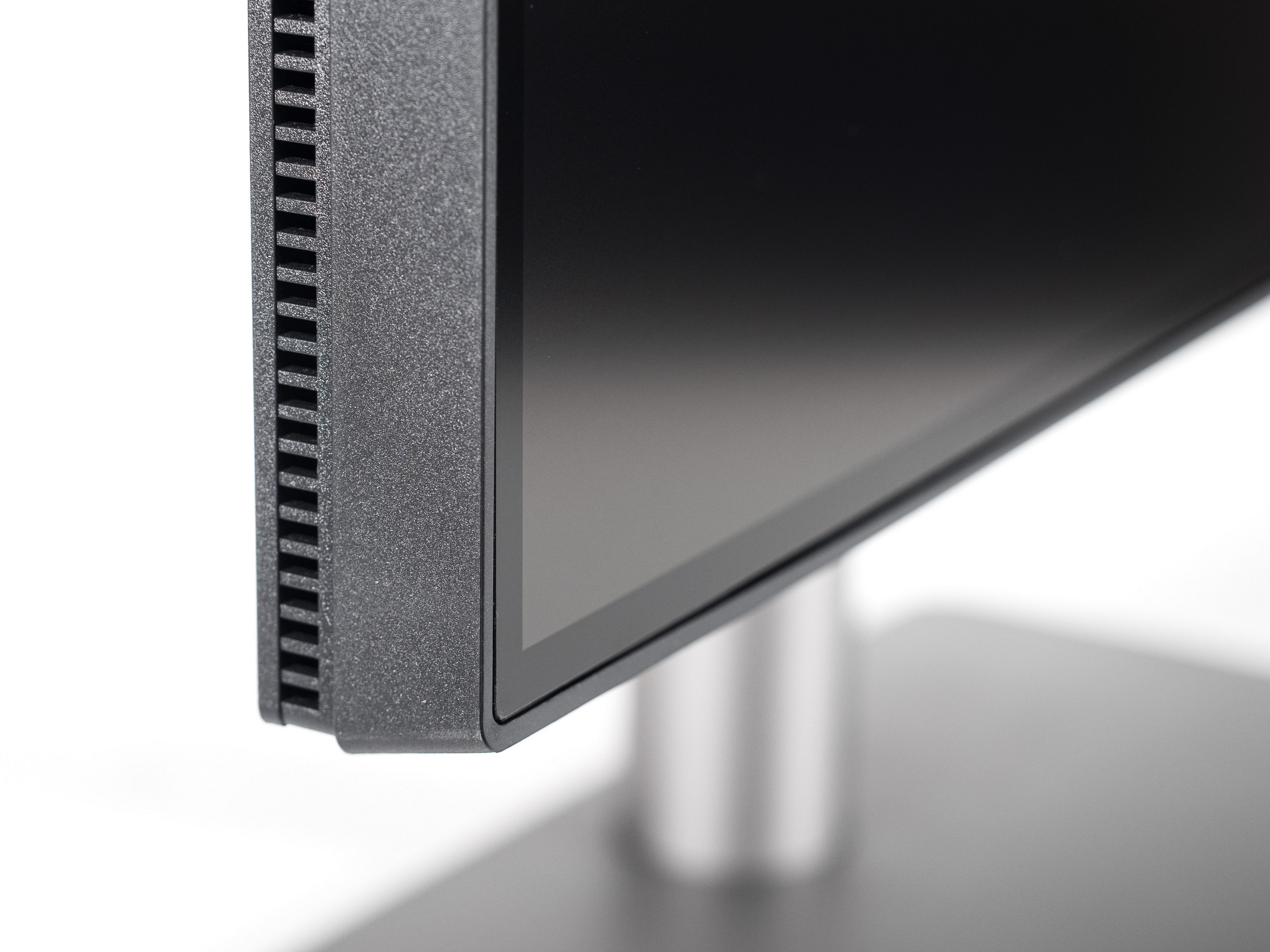Все крепёжные элементы монитора, в том числе внутренности центральной колонны и основание подставки, выполнены из металла. Для надёжного сцепления с рабочей поверхностью используется шесть резиновых ножек разной формы — им хорошо удаётся удерживать монитор в одном положении, в том числе благодаря достаточно большому весу устройства.