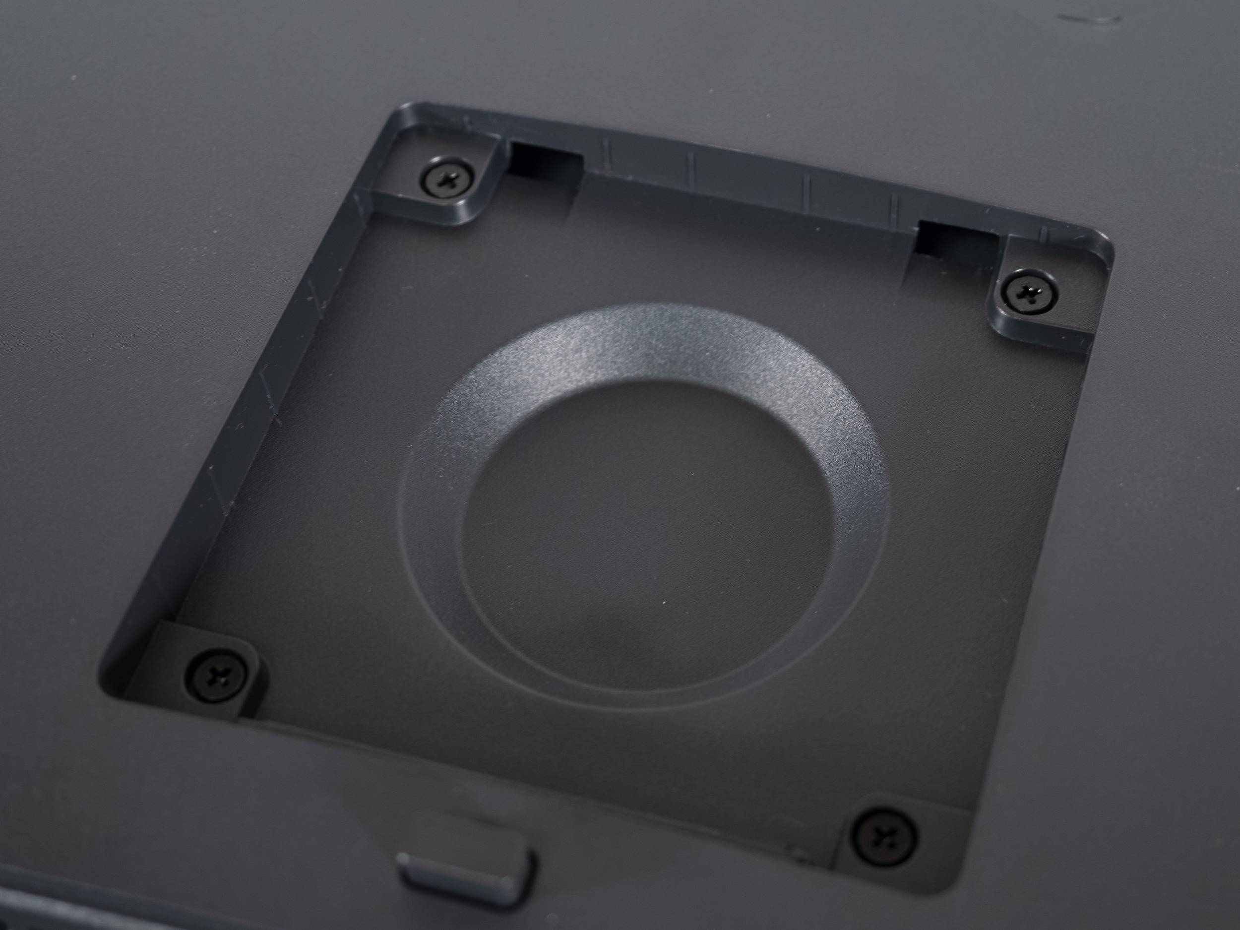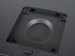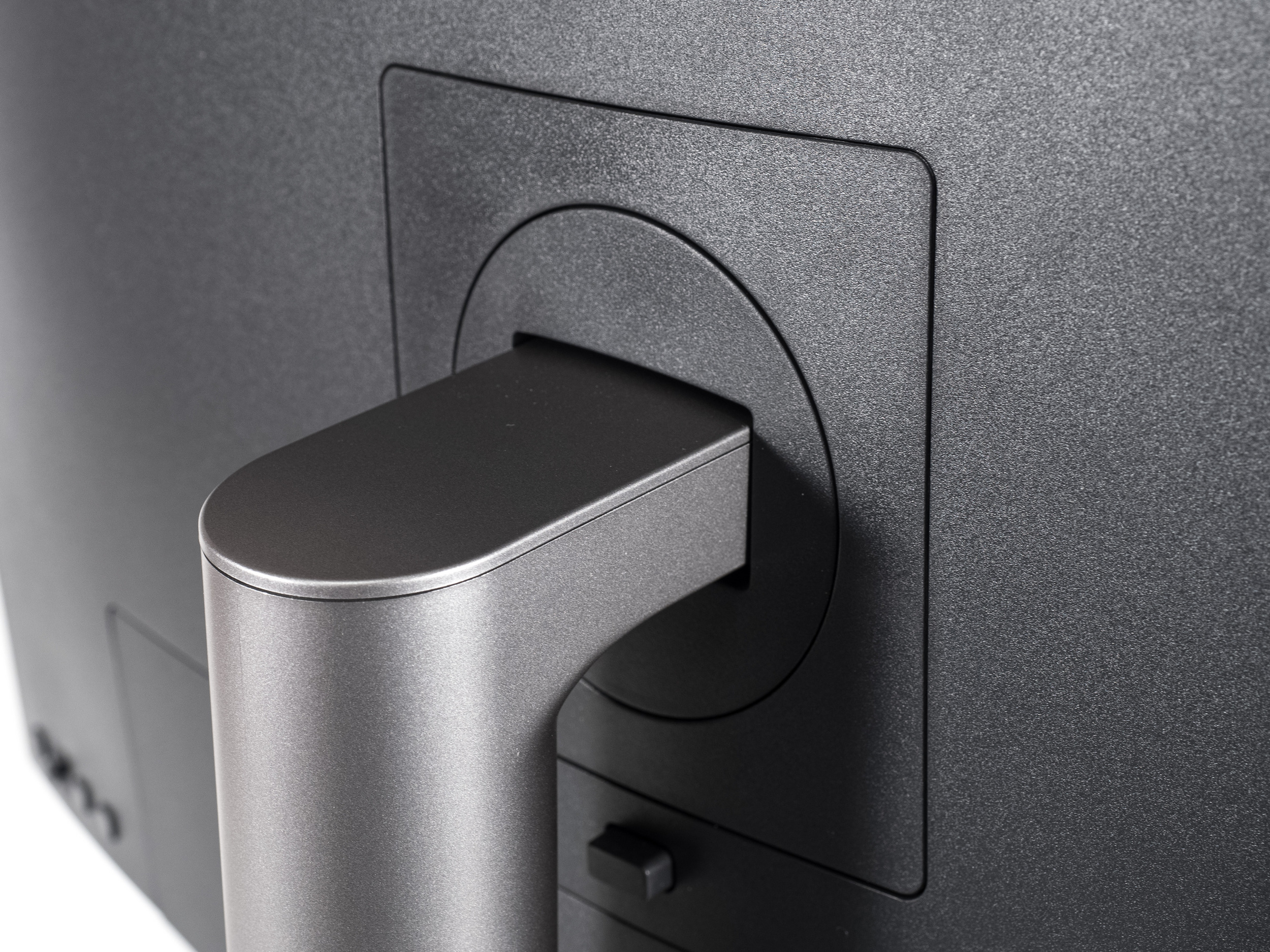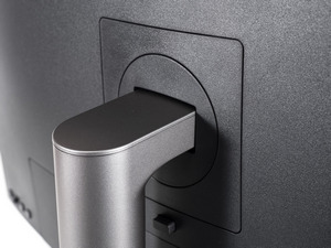 Центральная колонна крепится к монитору буквально за пару секунд и отсоединяется так же быстро — достаточно нажать на кнопку снизу. Отверстия под VESA-кронштейны слегка утоплены в корпус, но в большинстве случаев это не создаст проблем.