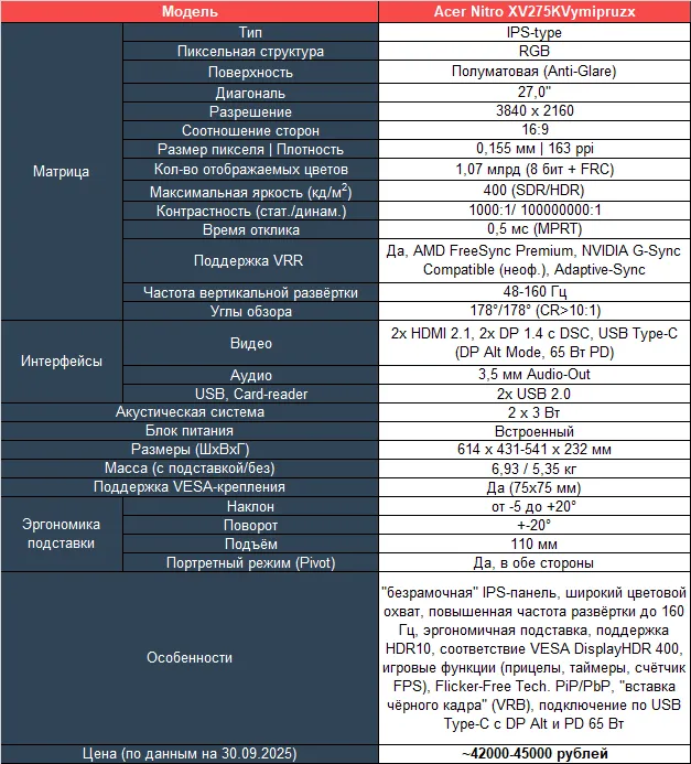 Выпущенный в продажу Acer Nitro XV275KV — игровой монитор с «изюминкой». В нём производитель сделал ставку на широкий набор функций за адекватные деньги и 4К-матрицу с цветовым покрытием полиграфического пространства AdobeRGB, что раньше практически не встречалось в сегменте скоростных UHD IPS за ~40000 рублей.