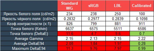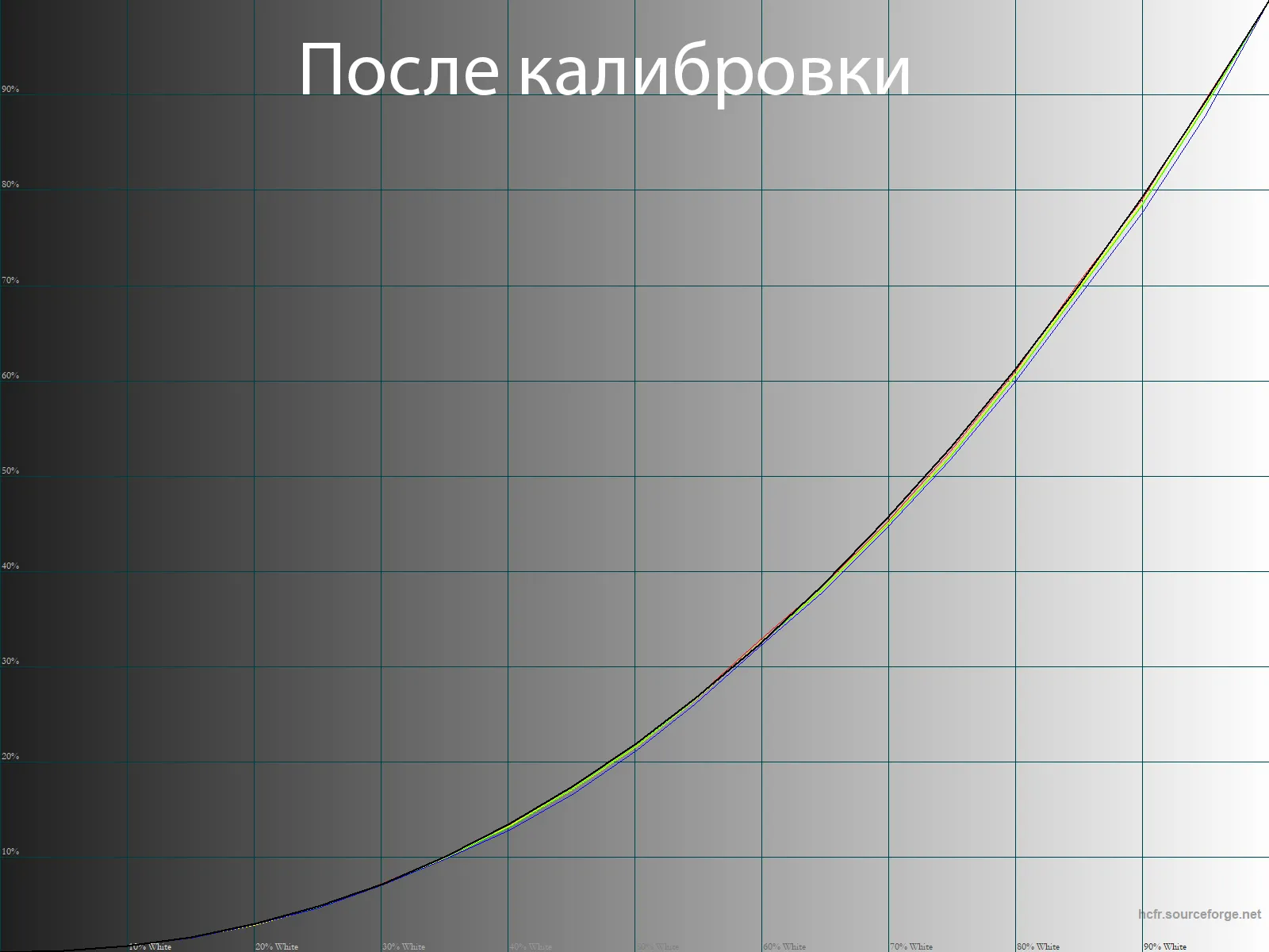 Привести цветопередачу в норму и дать системе всю необходимую информацию про возможности дисплея позволила калибровка совместно с созданием индивидуального цветового профиля. Отклонения DeltaE94 снизились до необходимого уровня, баланс серого слегка улучшился, тени стали лучше различимы, общий контраст повысился, а паразитные оттенки пропали.