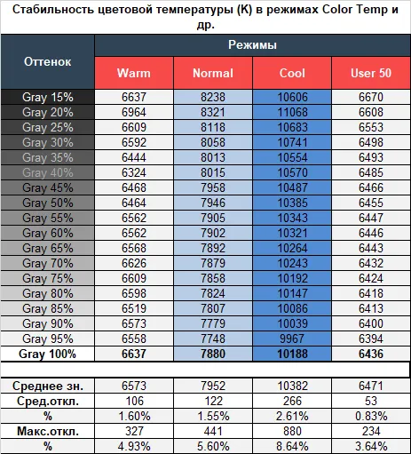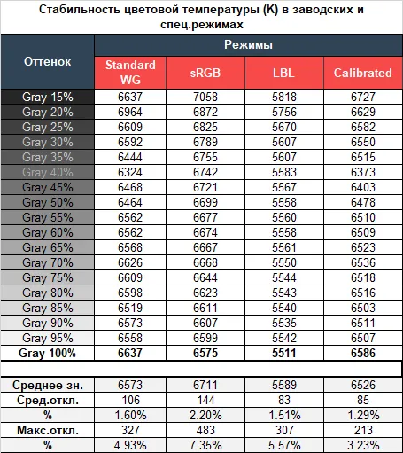 Среднее отклонение оказалось на уровне 1,6%, а максимальное — 4,3%, с разницей между измеренными минимумом и максимумом всего в 371К. Это прекрасный результат в общей массе мониторов и близкий к некоторым OLED.