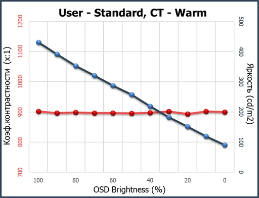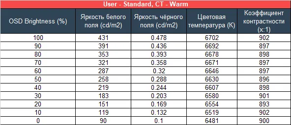 Для изучения стабильности контрастности и диапазона изменения яркости для начала был выставлен режим Standard с прочими настройками по умолчанию (ЦТ — Warm). Значение Brightness менялось с 100 до 0% с шагом в 10 единиц.