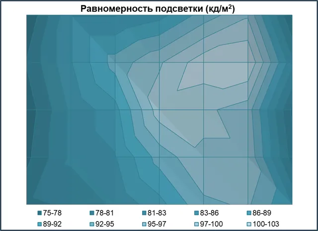 При установленной яркости среднее отклонение от центральной точки составило 11%, а максимальное — 24,2%. Для данного класса устройства результат типично средний или даже чуть ниже среднего.