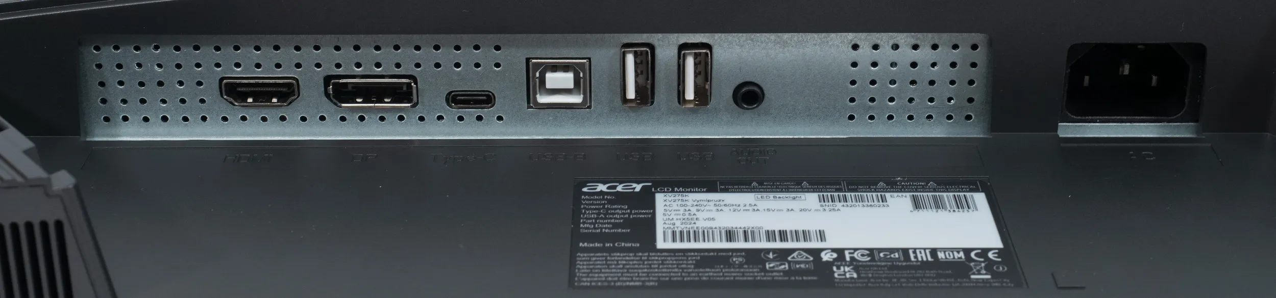Среди интерфейсов подключения монитор Acer Nitro XV275KV предлагает следующие: два порта HDMI 2.1, один DisplayPort 1.4 с поддержкой DSC, один USB Type-C с DP Alt Mode и зарядкой до 65 Вт, а также хаб USB Type-A версии 2.0 на два порта для подключения различной периферии. В последнем случае – выбор странный, а экономия на портах USB 3.0 — копеечная.