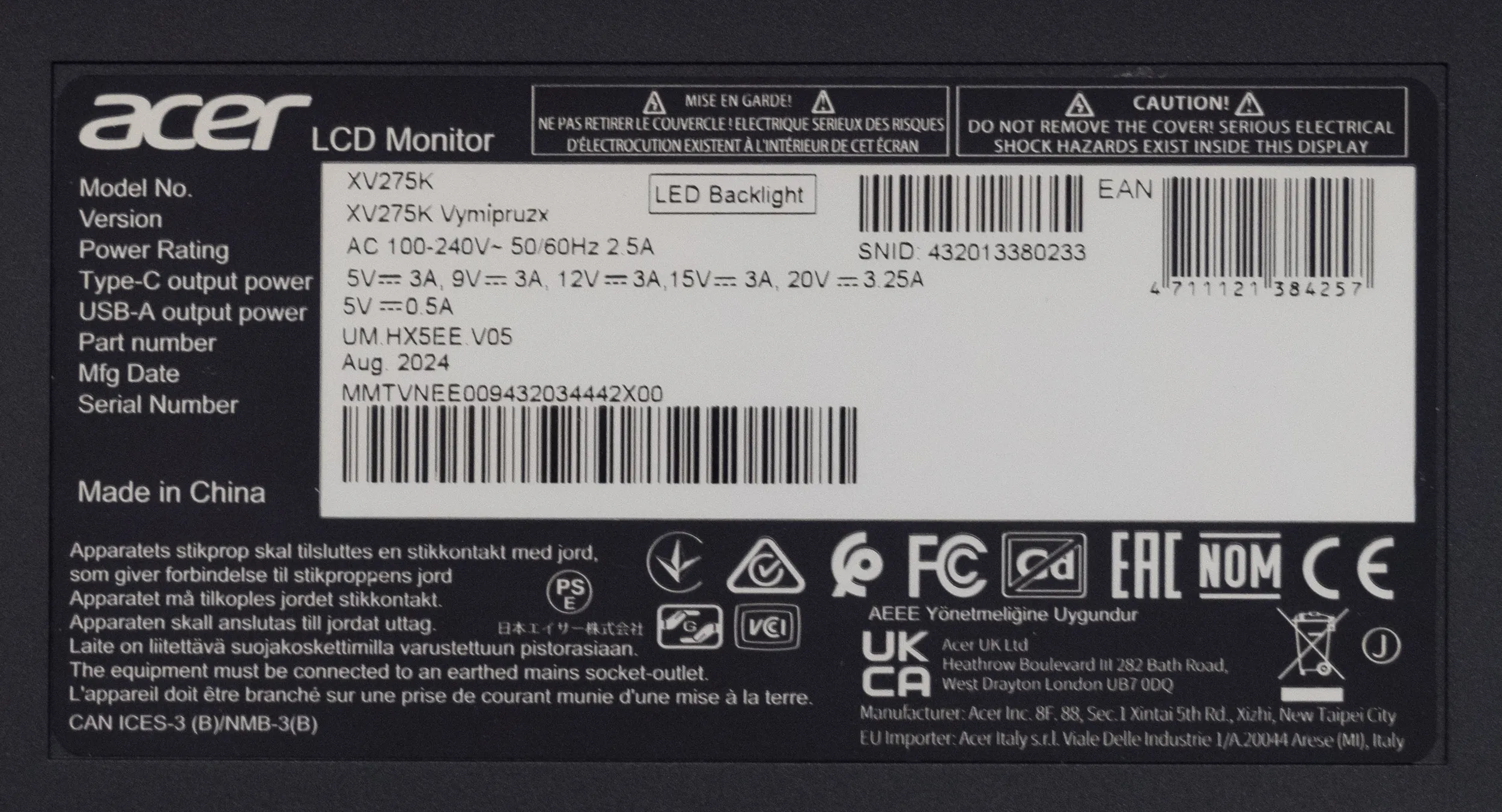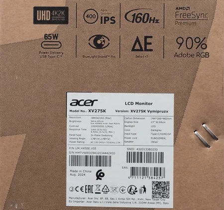 Благодаря одной из информационных наклеек можно узнать номер партии, серийный номер и полное название монитора, его массу и, судя по всему, примерную дату производства (август 2024 года). Монитор произведён на собственном заводе компании Acer.