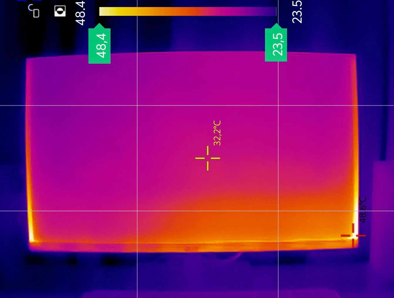 Средняя температура лицевой поверхности экрана в этом случае составила 36,2 градуса Цельсия, максимальное значение не превысило 49 градусов. Монитор ощутимо нагревается по краям корпуса и в его нижней части.