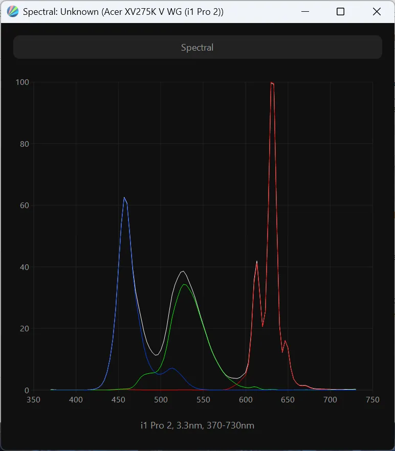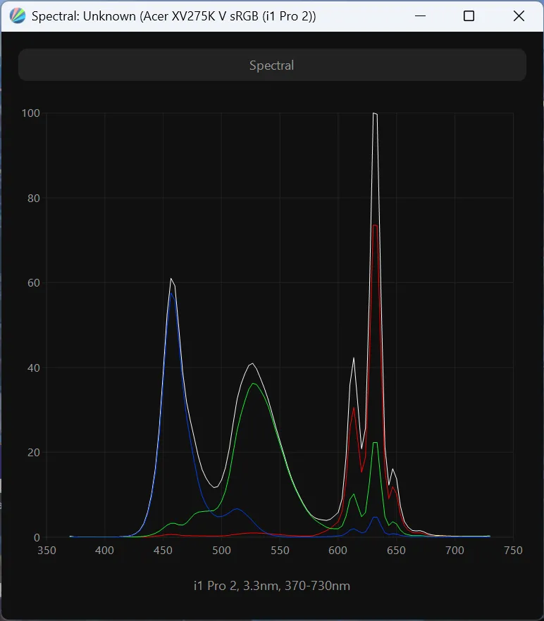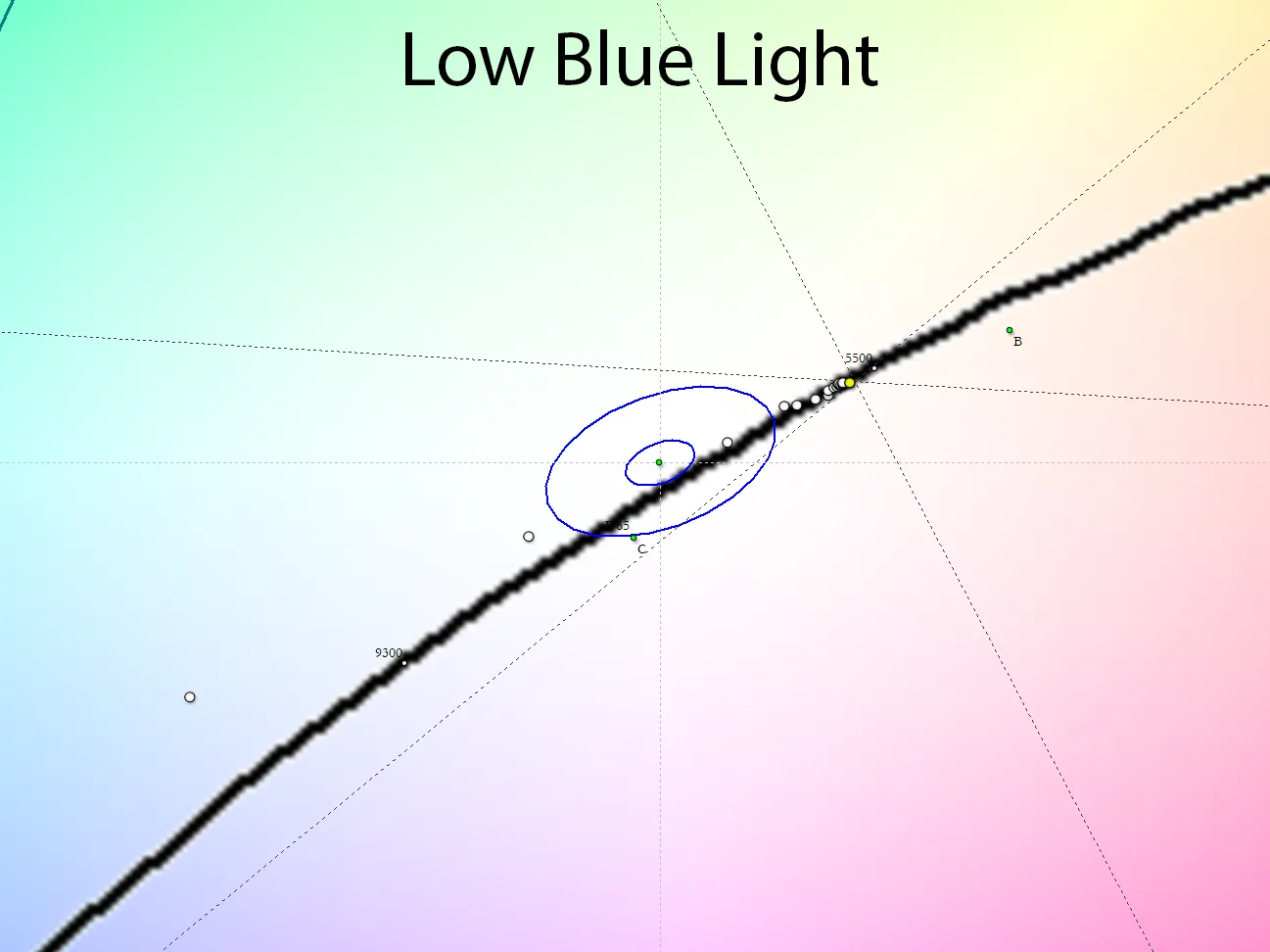 Был произведён ощутимый сдвиг пика синего в безопасную для глаз зону 456-460 нм. Это обеспечивает дополнительное снижение нагрузки на глаза совместно с отсутствием мерцания подсветки. Впрочем, обошлось без сертификатов безопасности, но есть указание о технологии BlueLightShield Pro.