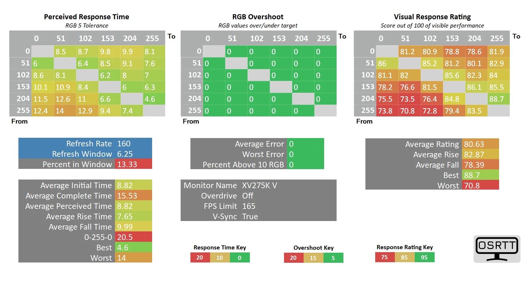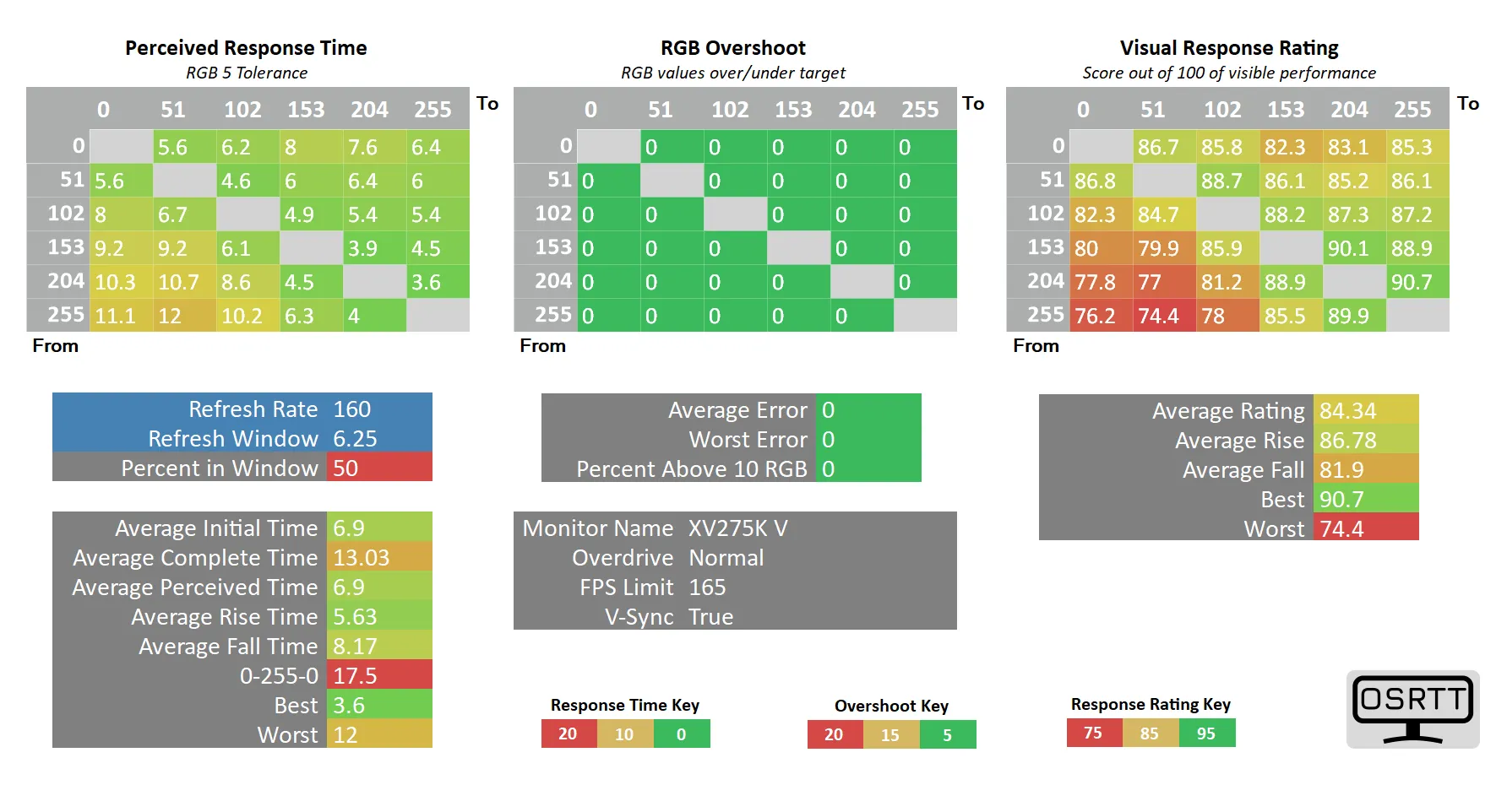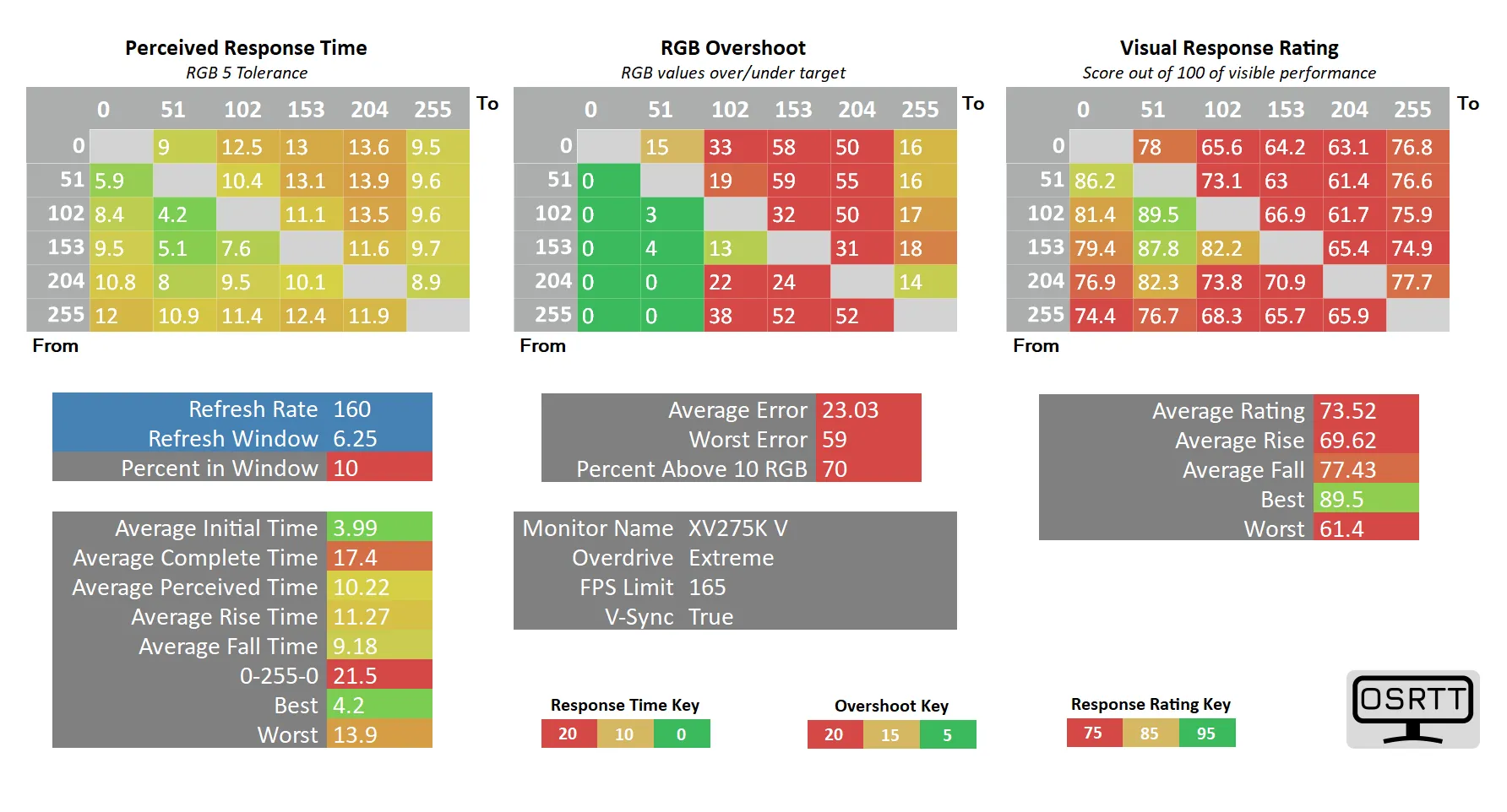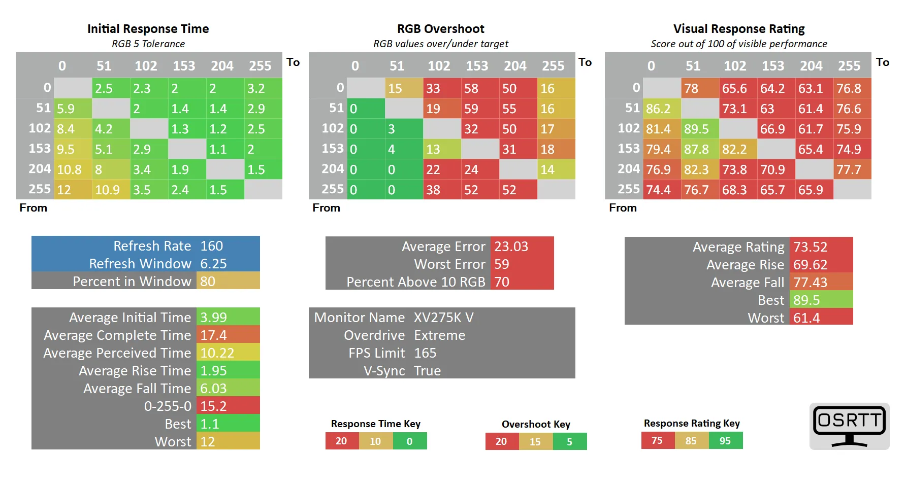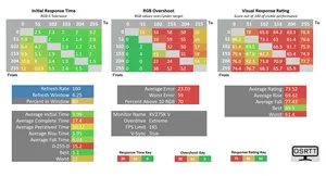 При оценке времени отклика программно-аппаратным комплексом OSRTT, учитывая строгую систему оценки, среднее время отклика (фактическое время — initial time) между различными оттенками серого составило 6,9 мс. После перехода к режиму Extreme можно получить меньшую цифру на уровне 4 мс, но с сильнейшими артефактами. Если разгон времени отклика отключить вовсе, то мы получим 8,8 мс — оно того не стоит.