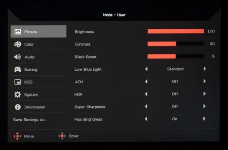 В арсенале монитора присутствуют технология высветления теней Black Boost, набор наэкранных прицелов, широкий выбор параметров настройки цветопередачи, включая 6-осевую цветовую коррекцию, режимы Low Blue Light и другие игровые пресеты.