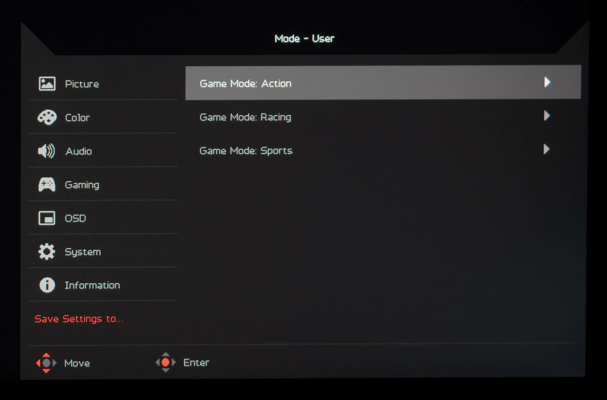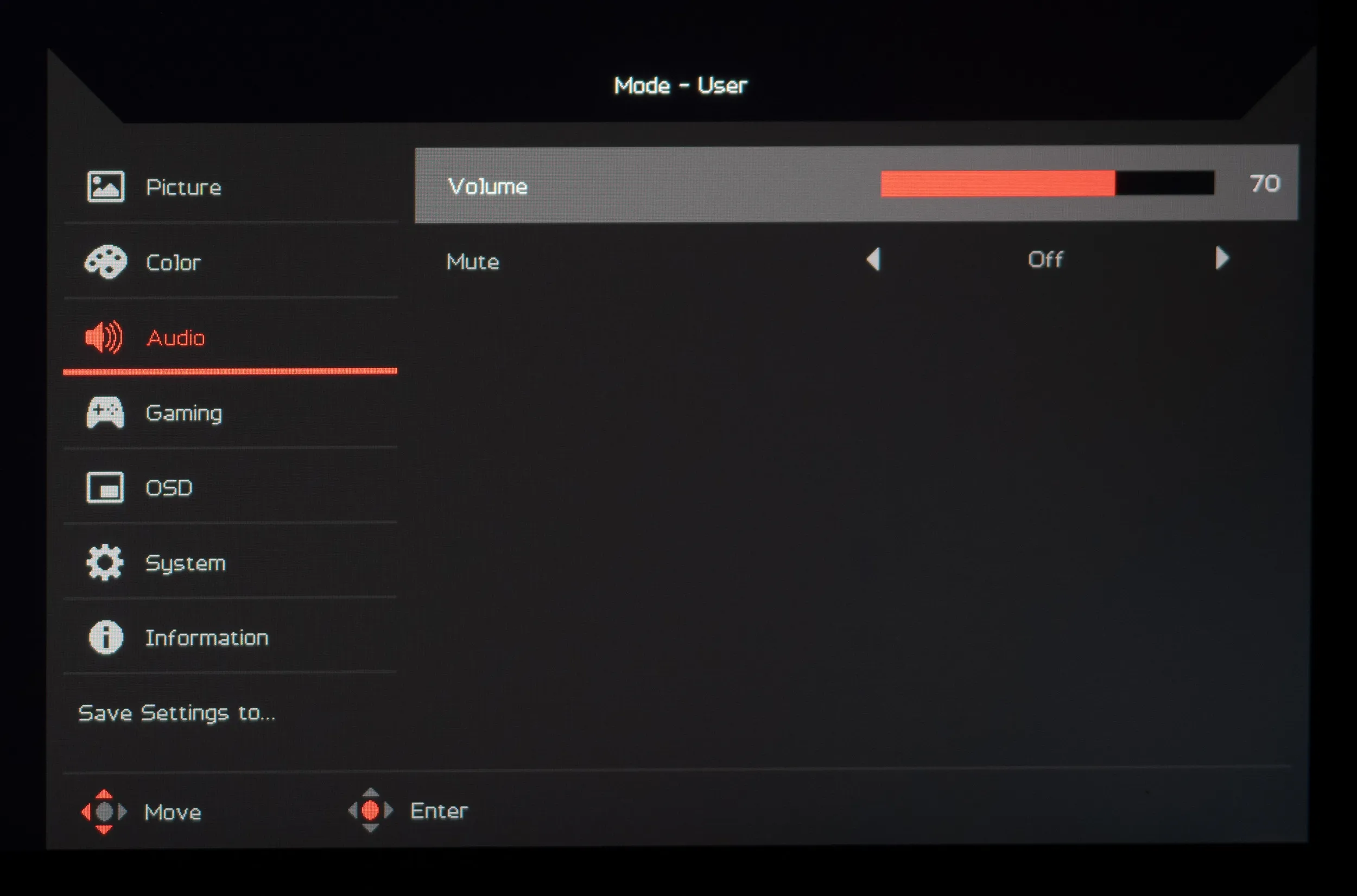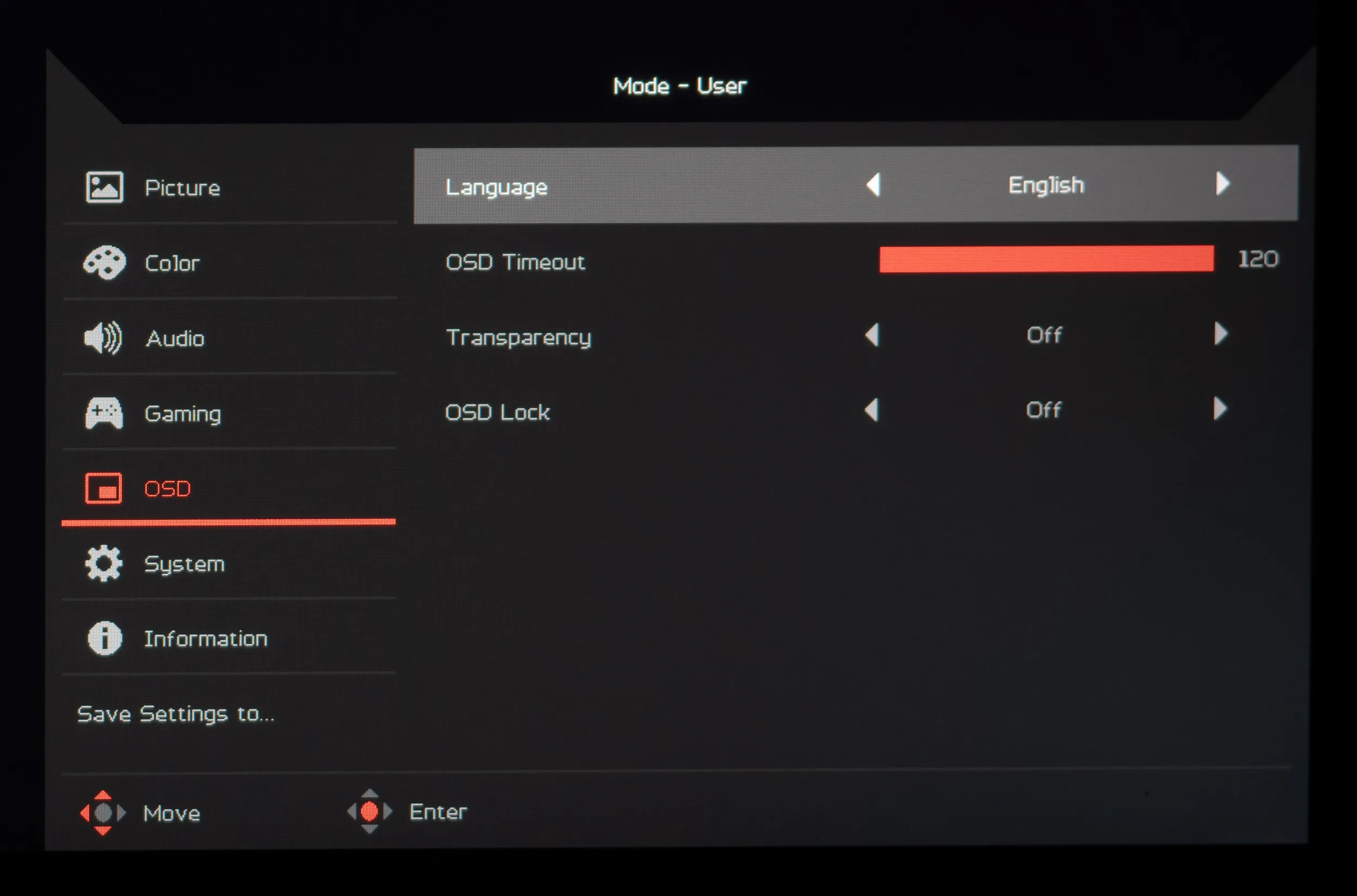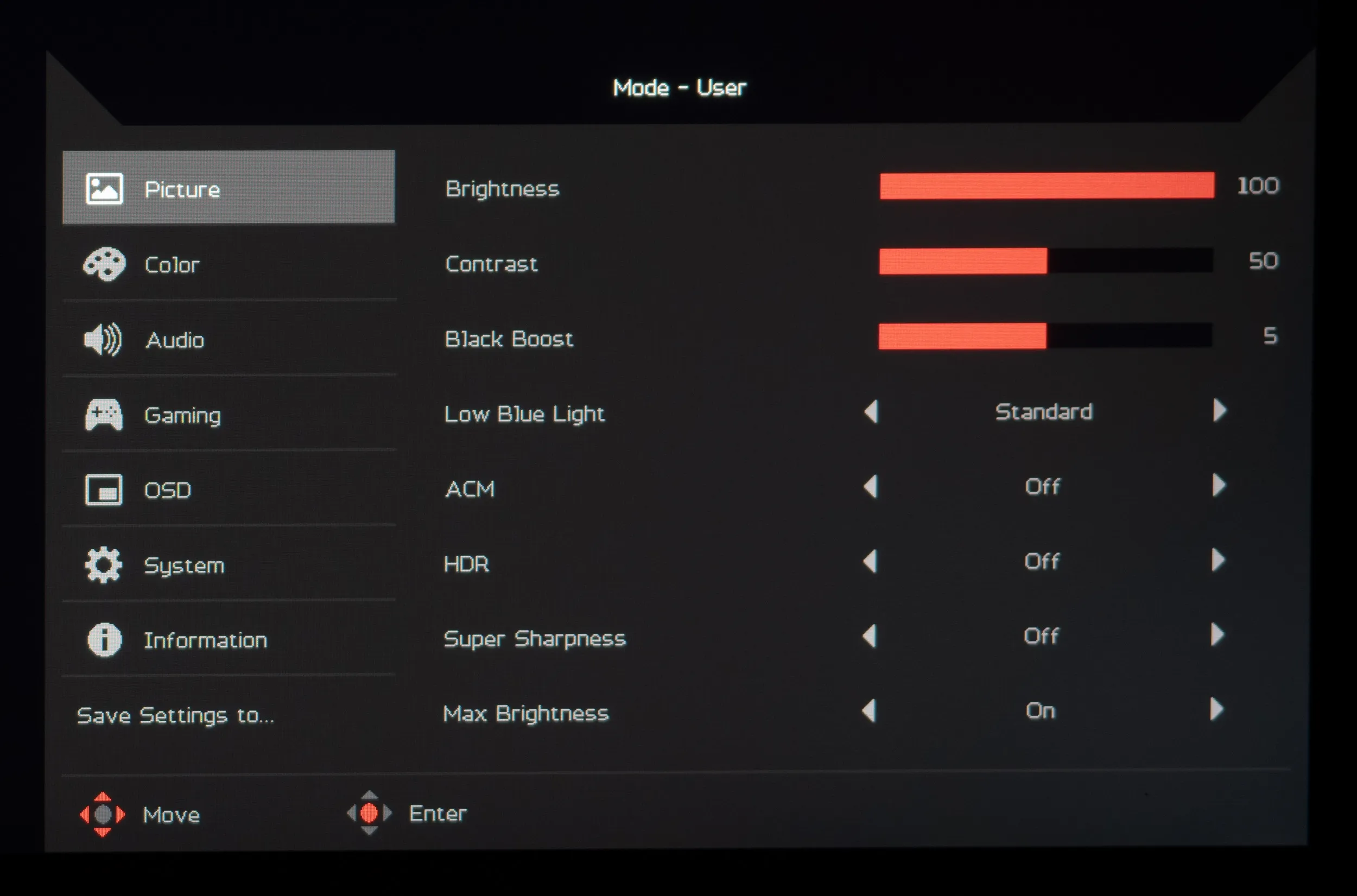 Внешний вид меню и его наполнение у Nitro XV275KV соответствуют тому, что можно встретить в большинстве новинок бренда из линейки Nitro (особенно из сегмента LCD): всё лаконично и строго, даже несмотря на наличие уже ставших классикой жанра красных элементов.