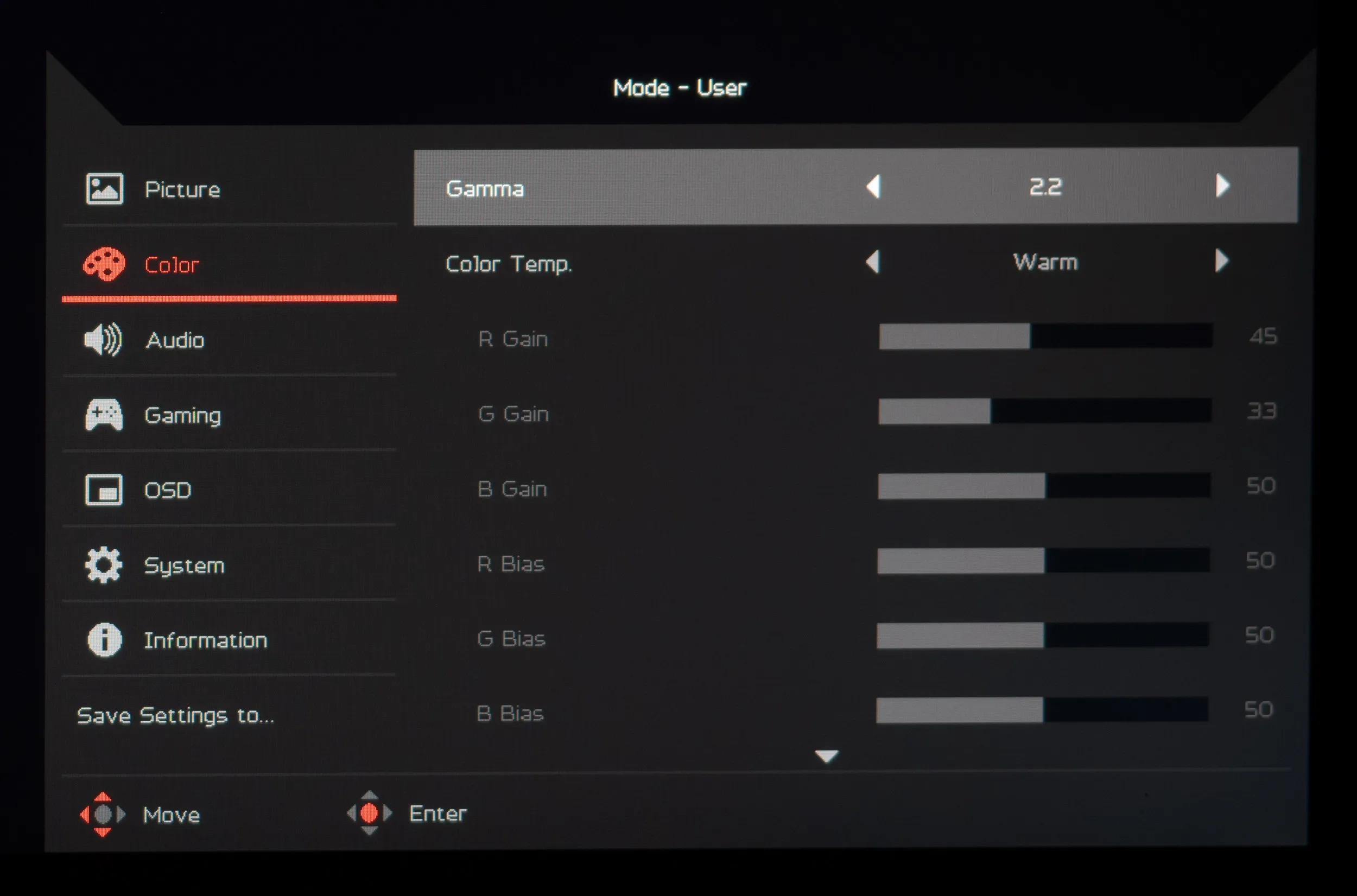 Для получения яркости 100 нит, цветовой температуры белой точки в 6500K и прочих улучшений в режиме User мы использовали следующие настройки: