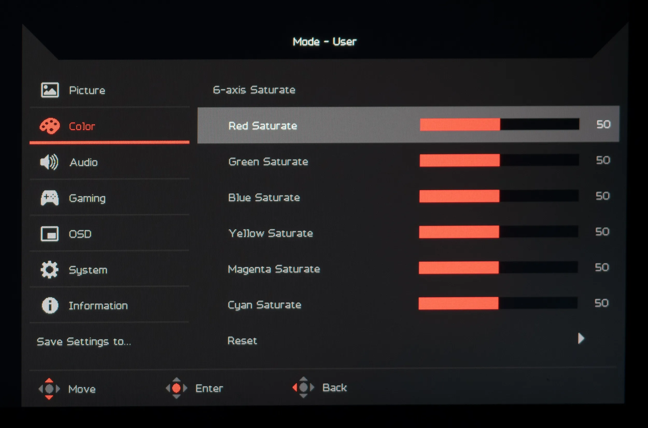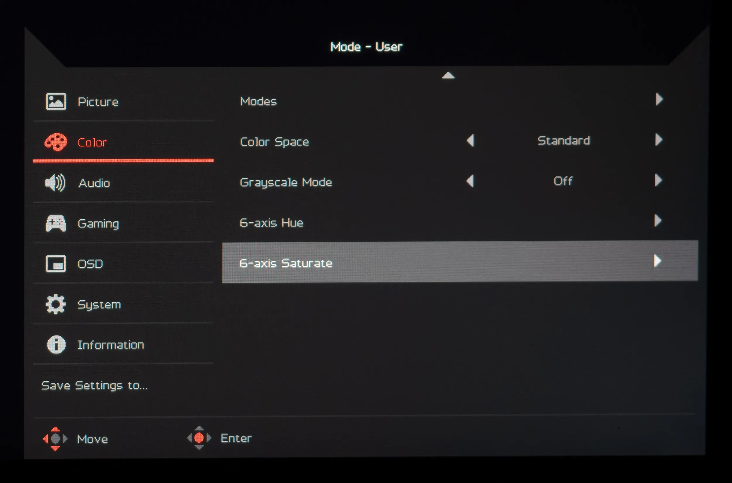 Следующий за ним раздел Color предлагает выбрать режимы гаммы и цветовой температуры, эмуляцию различных цветовых пространств (среди них только sRGB и фактически идентичный ему Rec.709, но с иной гаммой), входящих в возможности установленной матрицы, активировать чёрно-белый режим (градации серого), перейти к предустановленным игровым режимам и провести 6-осевую коррекцию по оттенку и насыщенности (но делать это мы не рекомендуем — станет только хуже).