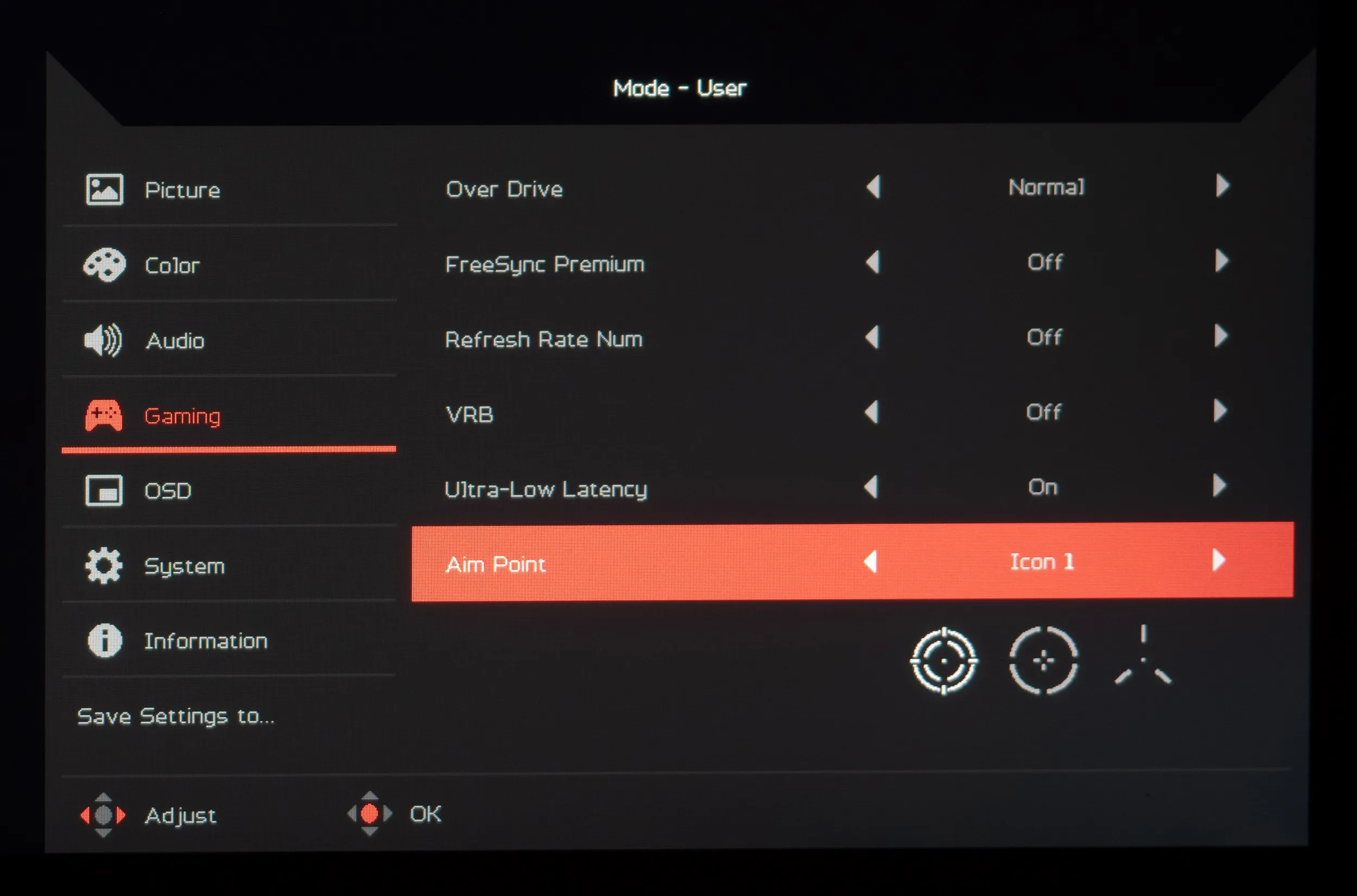 Раздел Gaming позволяет отрегулировать уровень разгона матрицы, активировать один из подрежимов VRB или технологию AMD FreeSync Premium (необходима и для возможности активации G-Sync Compatible), а также включить счётчик fps или один из вариантов наэкранного прицела. Активация VRB (вставка «чёрного кадра») доступна только после выключения поддержки AMD FreeSync Premium — одновременная работа двух технологий не предусмотрена.