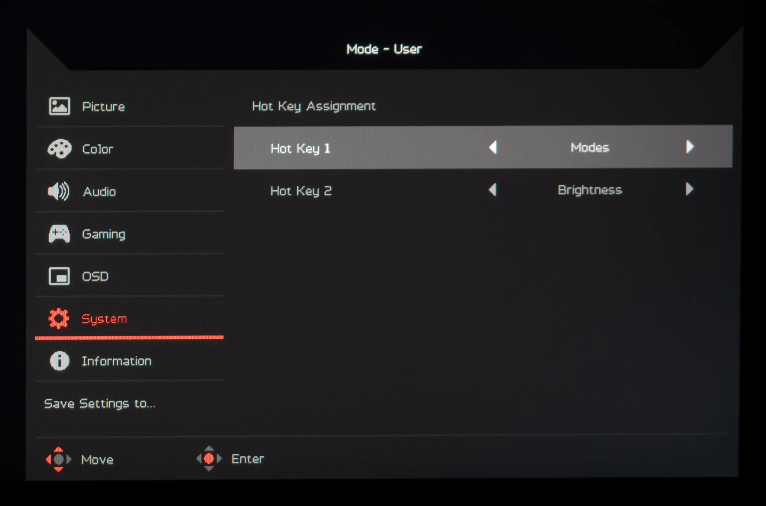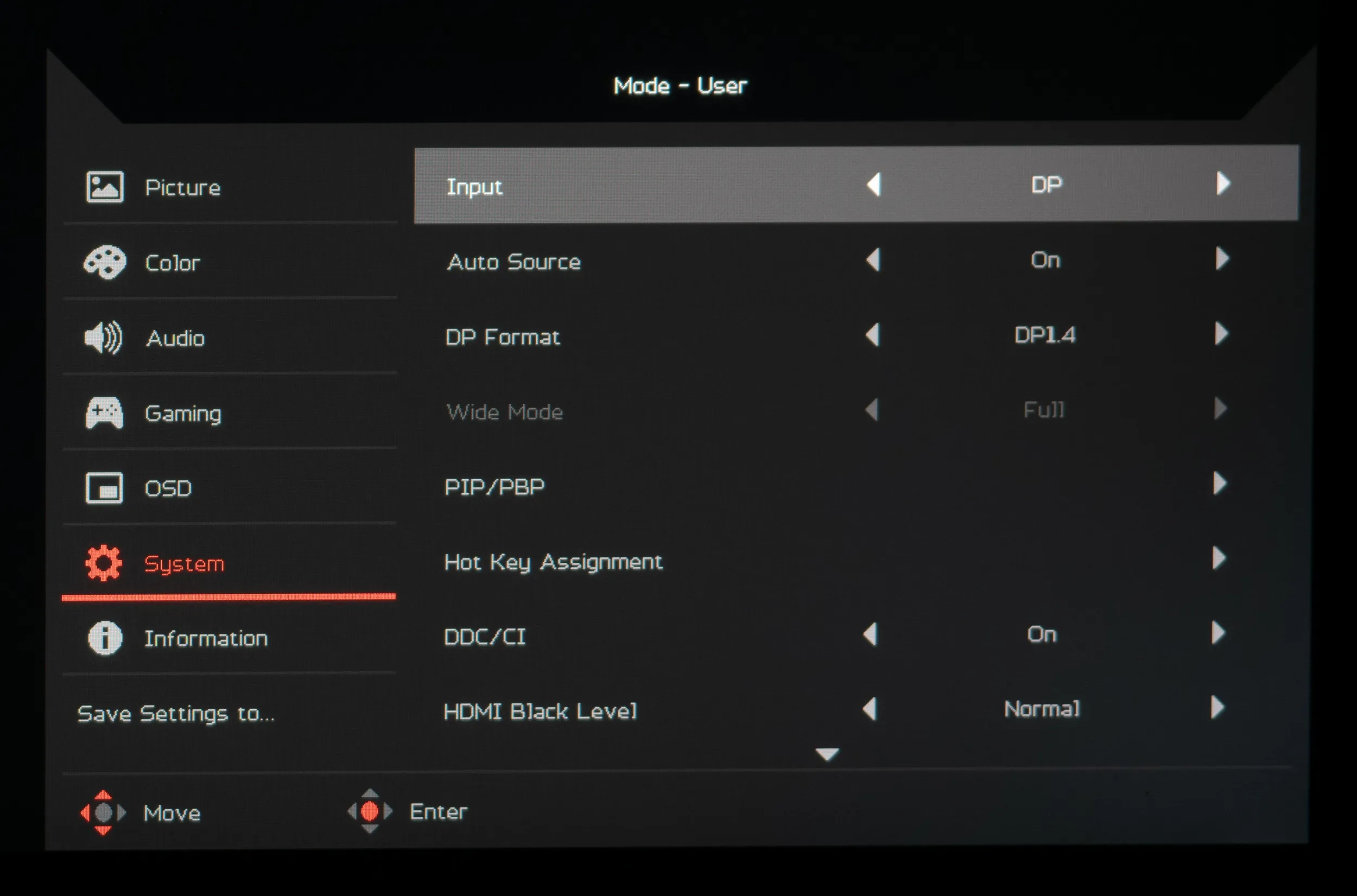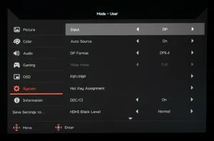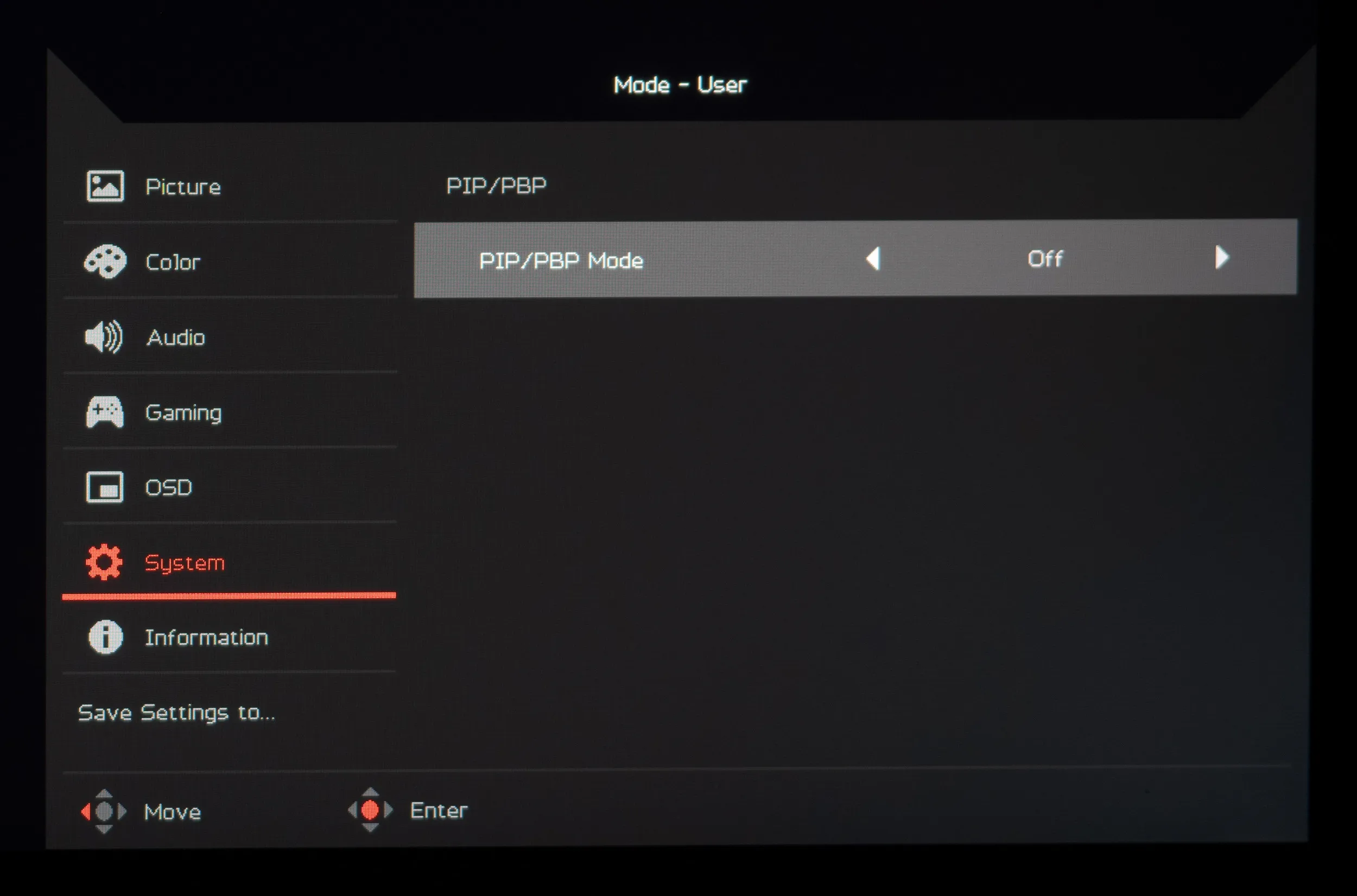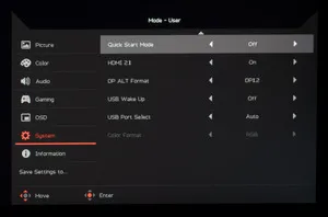 Чтобы перейти к выбору режима работы функций PiP/PbP и выбрать источник сигнала, необходимо зайти раздел под названием System. Здесь же можно получить доступ к изменению функций для двух параметров с быстрым доступом, выбрать режим работы скалера изображения, отключить зарядку по USB при выключенном экране и выбрать поддержку HDMI 2.1 для лучшей совместимости.
