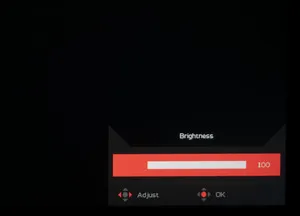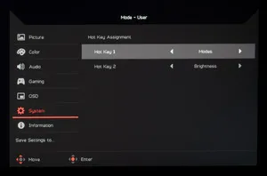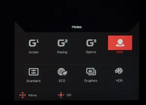 Если нажать на джойстик или перевести его в любую позицию, на экране появляется прямоугольный блок со следующими возможностями: активация предустановленных режимов изображения, регулировка яркости, выбор источника сигнала и переход к основному меню. Две функции быстрого доступа можно переназначить через специальный подраздел в меню.