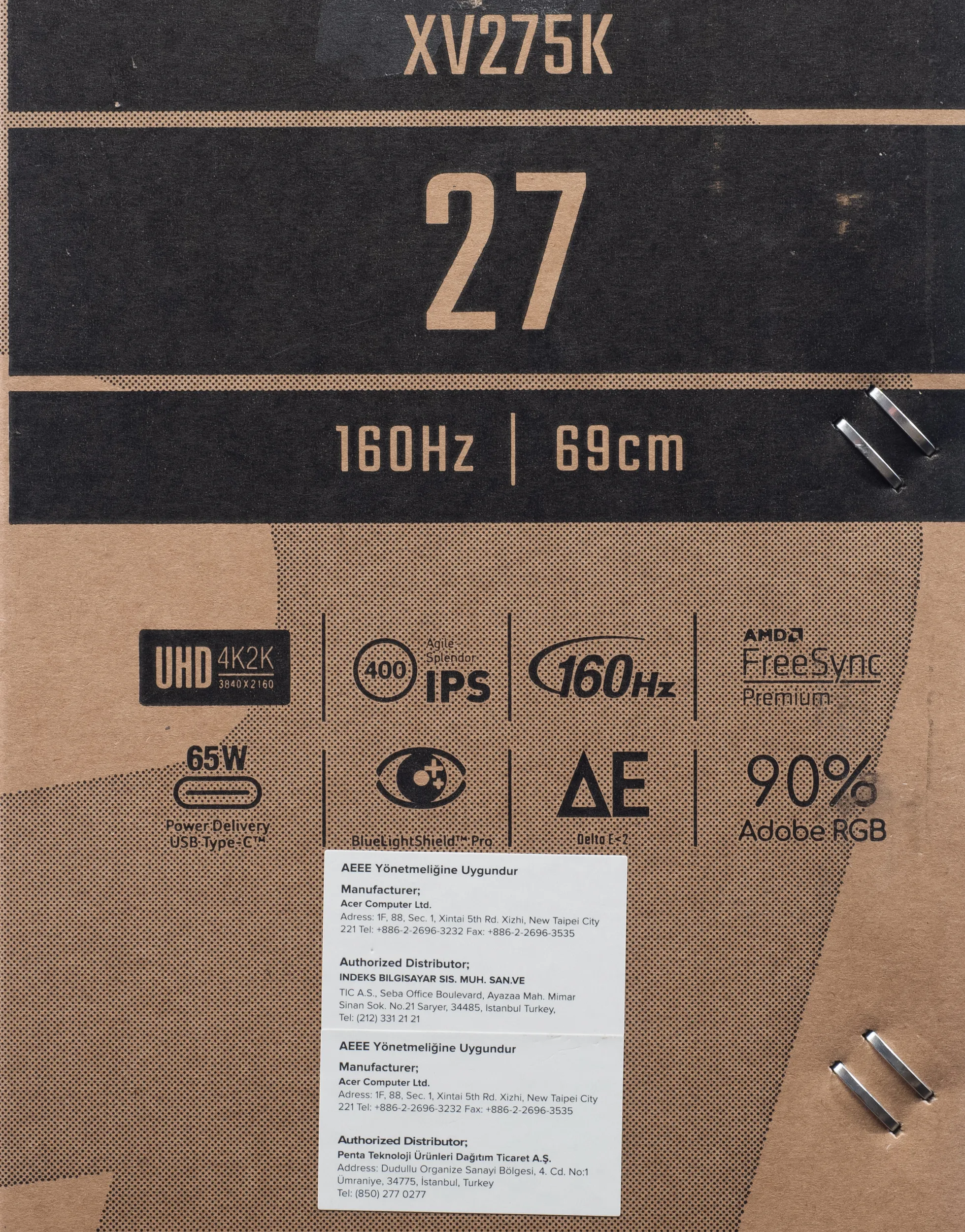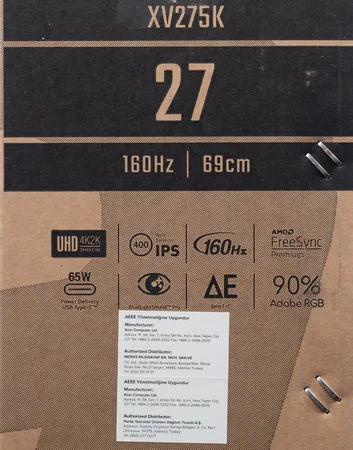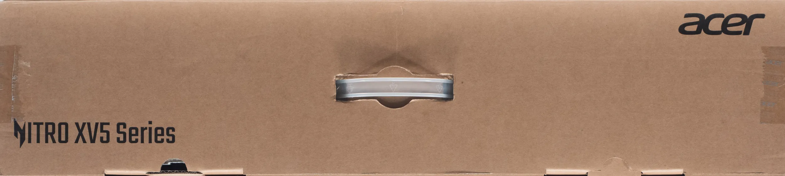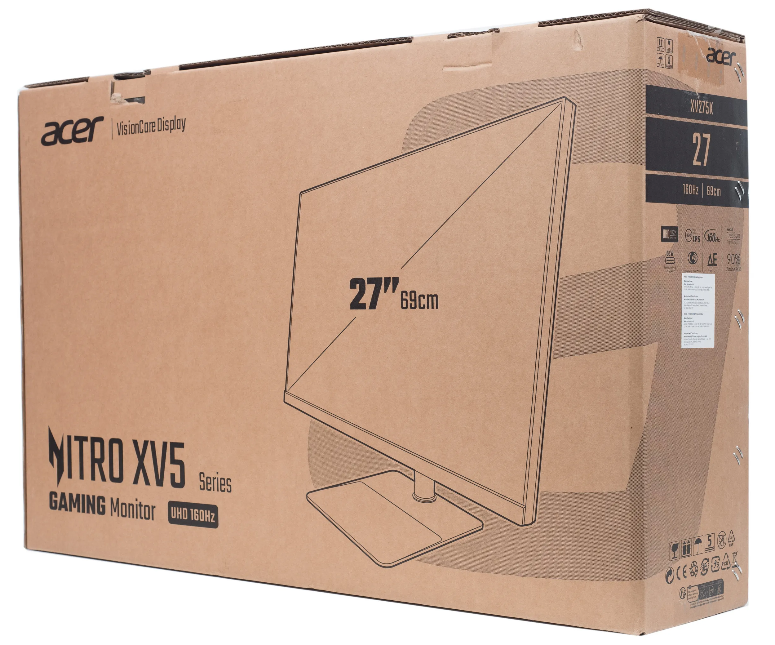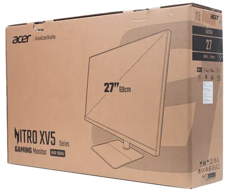 Монитор Acer Nitro XV275KV поставляется в крупной и увесистой коробке из некрашеного картона с достаточно простым оформлением. Представлены схематичные изображения модели с двух сторон, указаны серия и название дисплея.