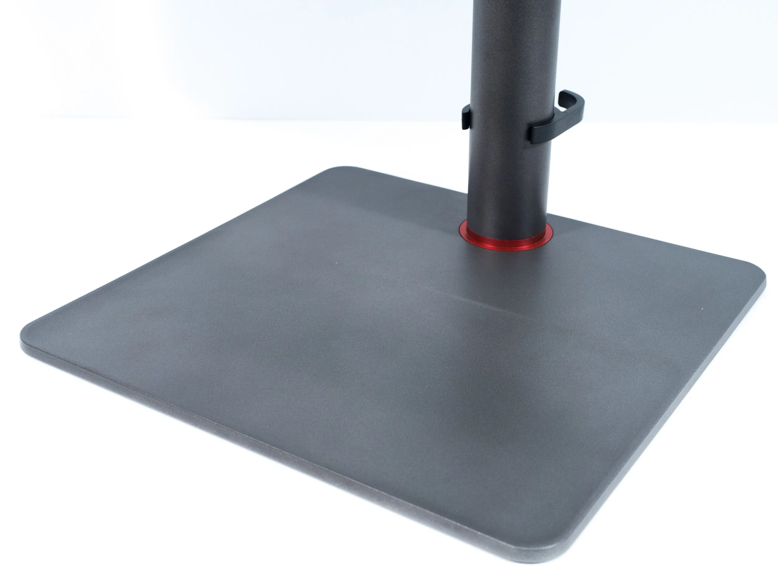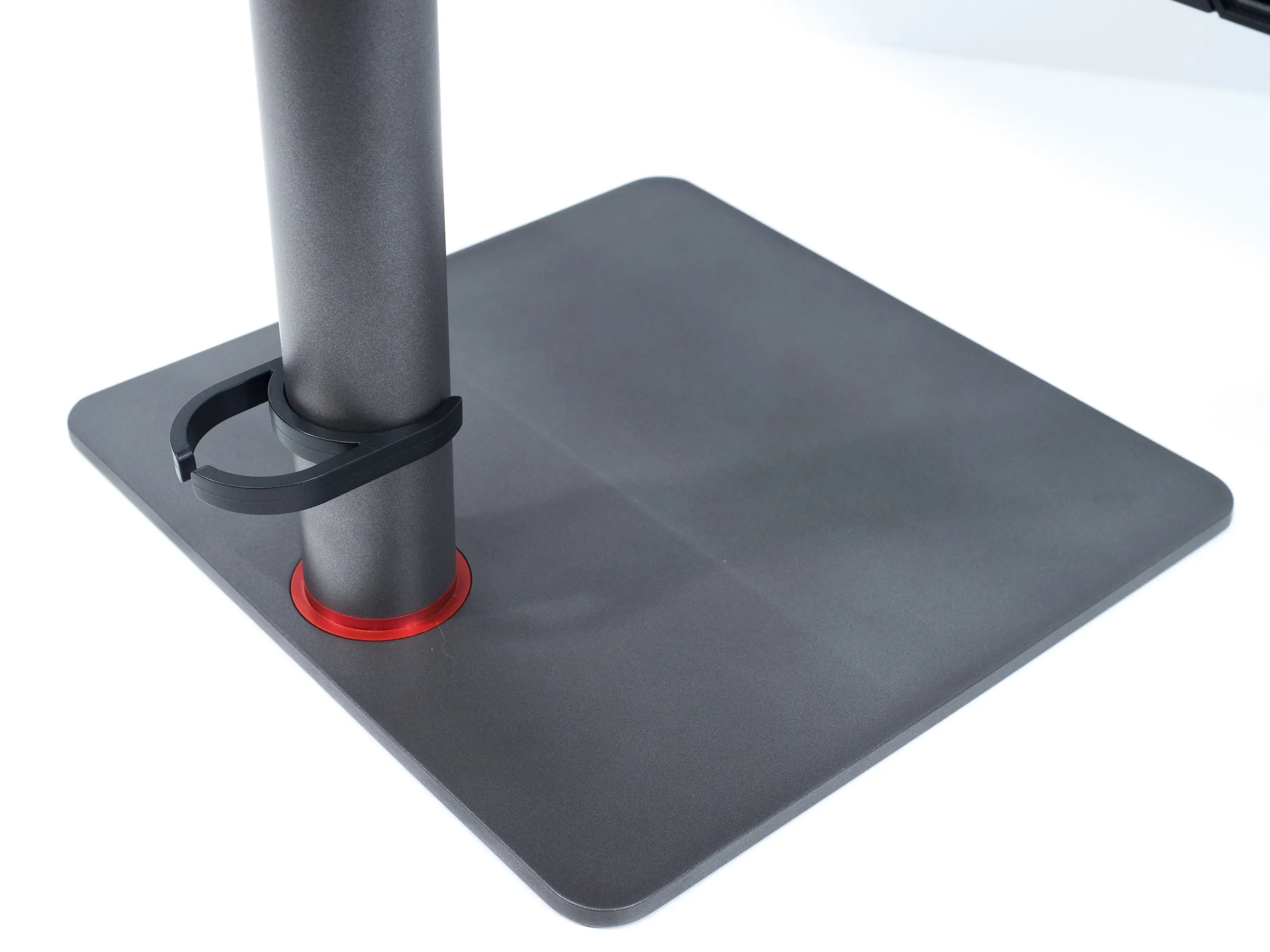 Крупная почти квадратная подставка представлена из куска литого алюминия, покрашенного в серый цвет порошковой краской. В центре она имеет покатую поверхность, создавая некую зону для всякой всячины. Центральная стойка сделана тоже из алюминия, а в её нижней части используется красное декоративное кольцо.